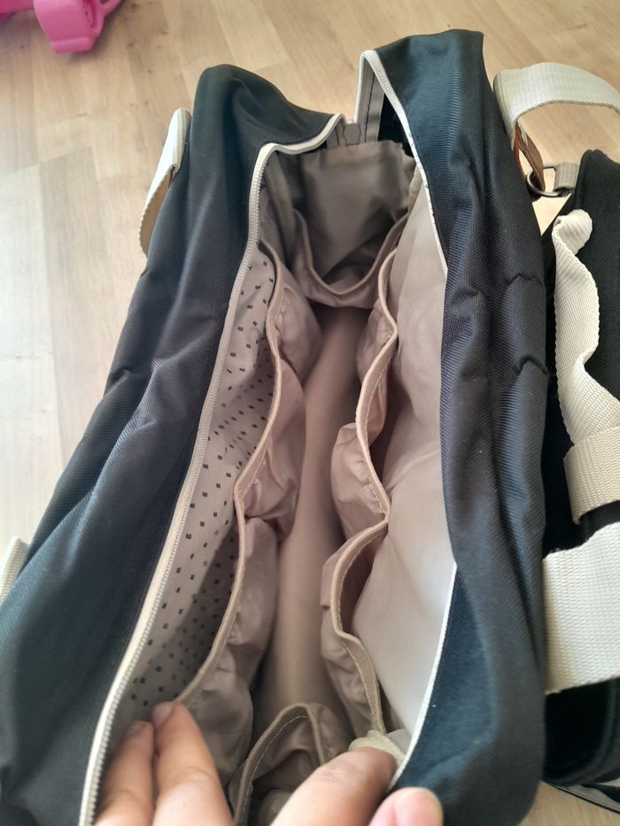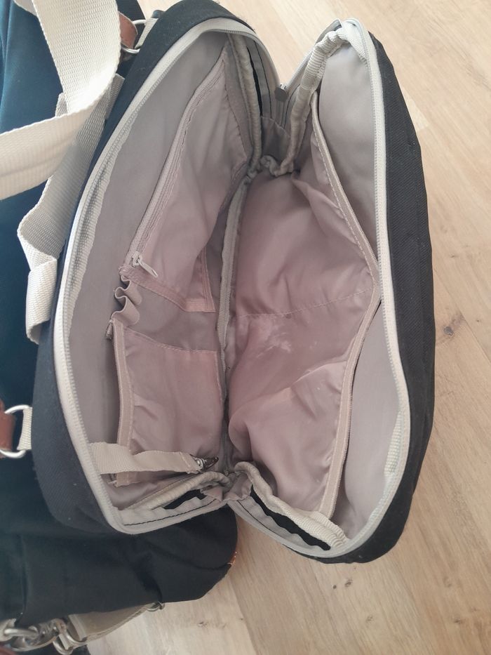 Sac à langer avec pleins de poches, possibilité de l'attaché à la poussette. La pochette avant peux être utilisé seule, il y a une bandoulière.