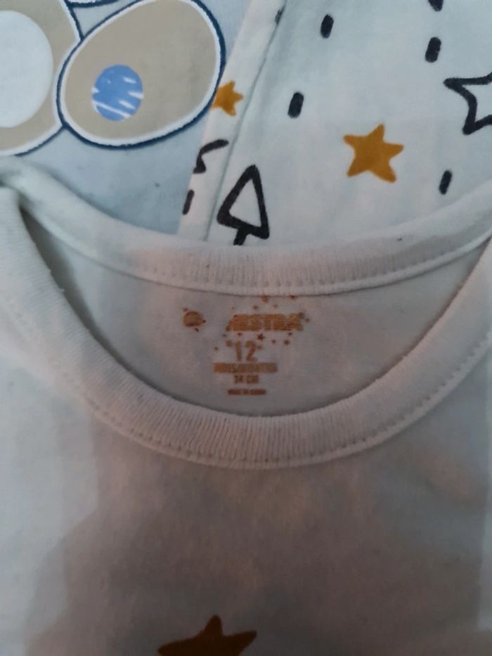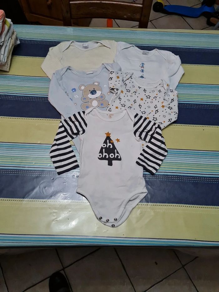 Lot de 5 bodies 12 mois en bon état. Multi marques: 2 orchestra, 1 mot d'enfant et 2 sans.