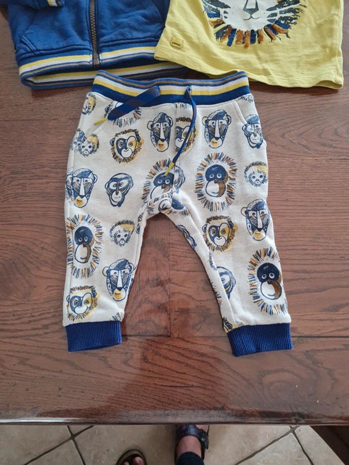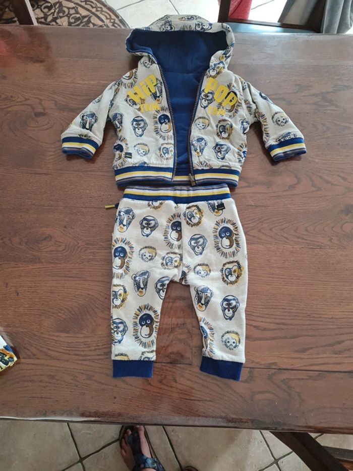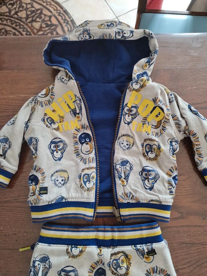 Taille assez petit dû à la marque, mettable dès le 6 mois. Gilet reversible. Très bon état, peu portés. Pull aussi de la même collection sur mon dressing.