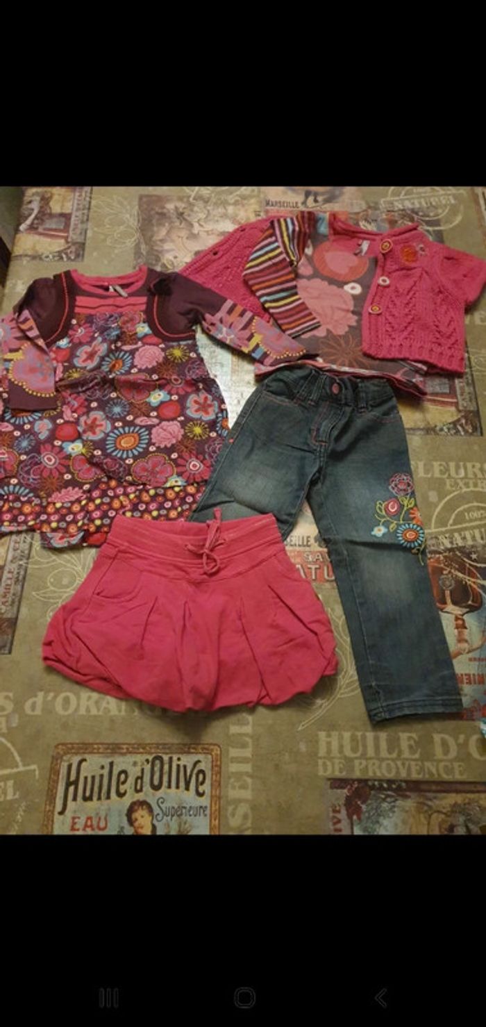 Bon état bien que portés. Très jolis rendus. Bien regarder les photos: 5 pièces en tout de la même collection: reste robe, jupe , gilet long, 1 tee shirt et le bolero. Pantalon jean et Tee-shirt fleuris vendus.