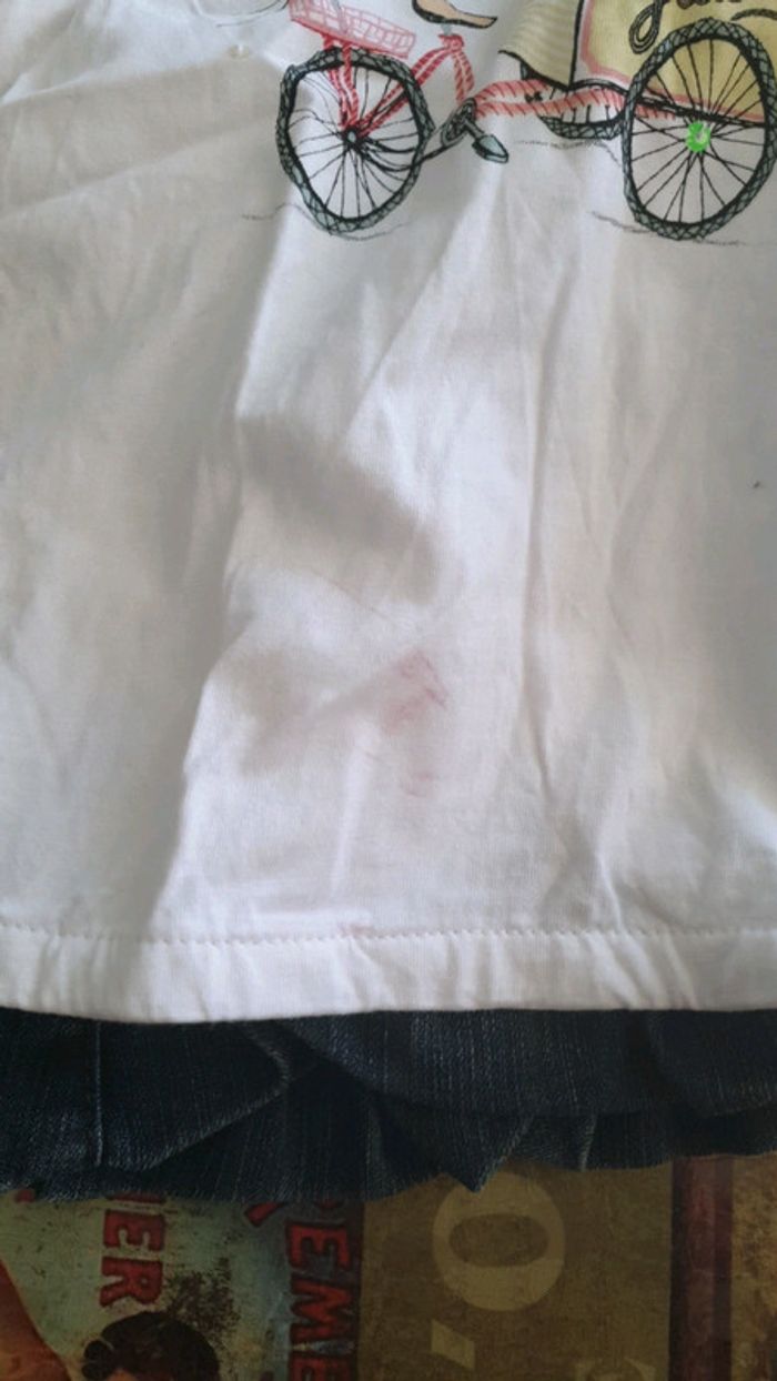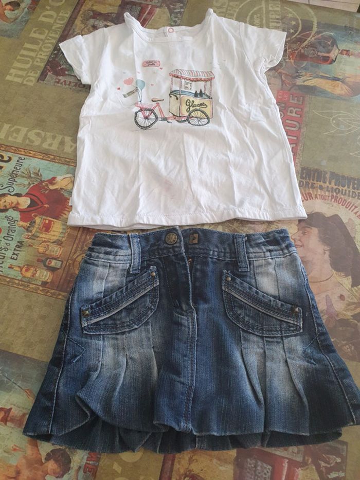 Bon état Jupe jean de chez Tao 4 ans en très bon état. Possibilité vente seule à 3e. Tee-shirt de chez sergent-major, tâche en bas du tee shirt que je vais essayer de supprimer en le relavant, si vente seul à 2e.