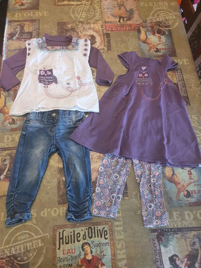 Bon état. Même collection Orchestra. 2 ensembles: jean slim élastique en bas taille 2 ans, robe, tunique, legging et sous pull allant aussi bien avec l'un ou l autre.