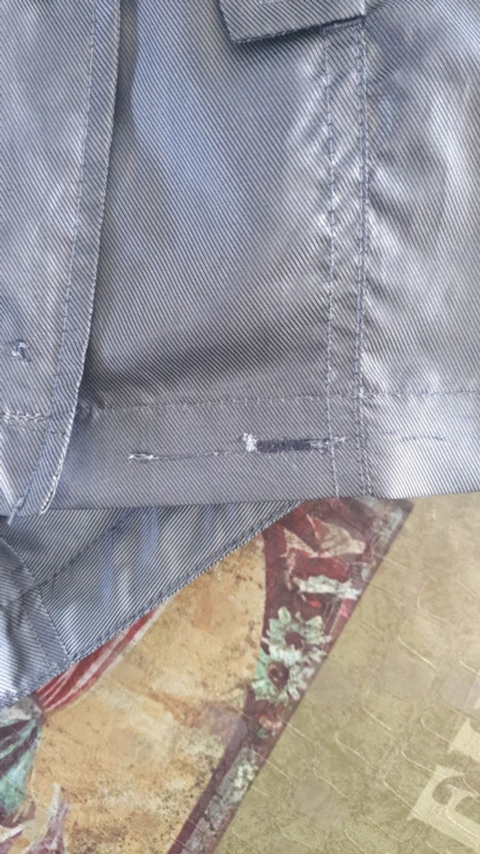 Satisfaisant. Accros en bas recollés. Petit chat collé déjà sur un trou. Couleur bleu gris.