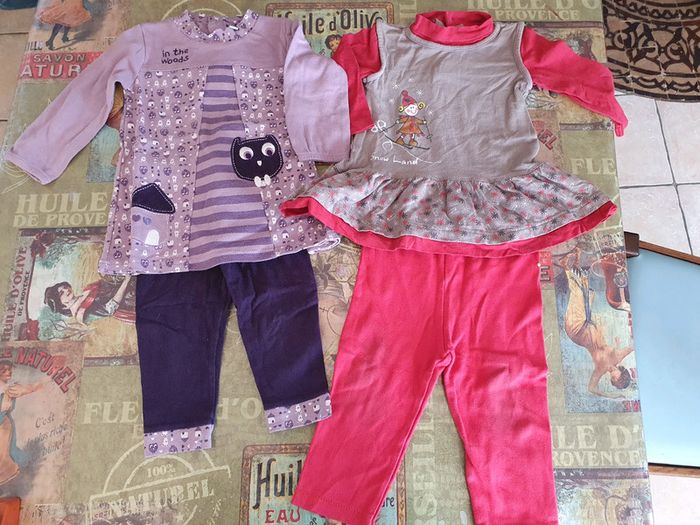 Bon état. 18 mois. 3e l ensemble, 5e les 2. Legging rouge un peu taché aux genoux, je relaverais pour essayer de les enlever.