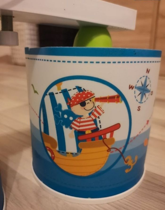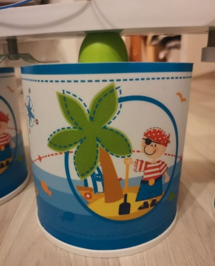 Suspension 3 lampes thème pirate pour chambre d'enfant. Parfait état, fixation plafond universel réglable, fonctionne avec 3 ampoules culot E27 (non fournies). Plafonnier d'excellente qualité, valeur neuve, environ 50€.