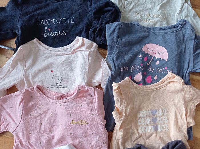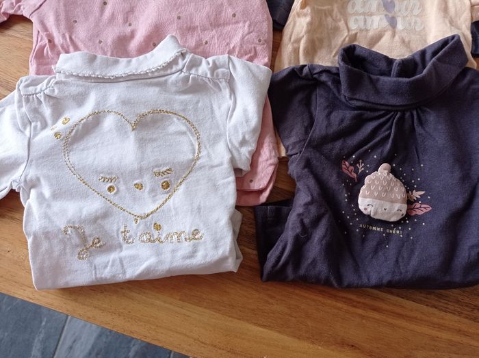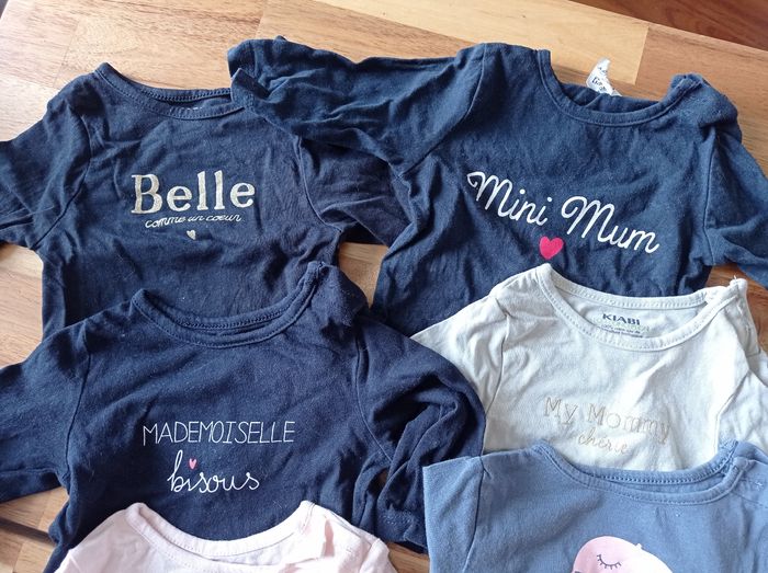 Lot de 10 tee shirt 7 manches longues 1 manche courte 2 col roulé Très bon état, taille 1 mois. Principalement de la marque Kiabi.