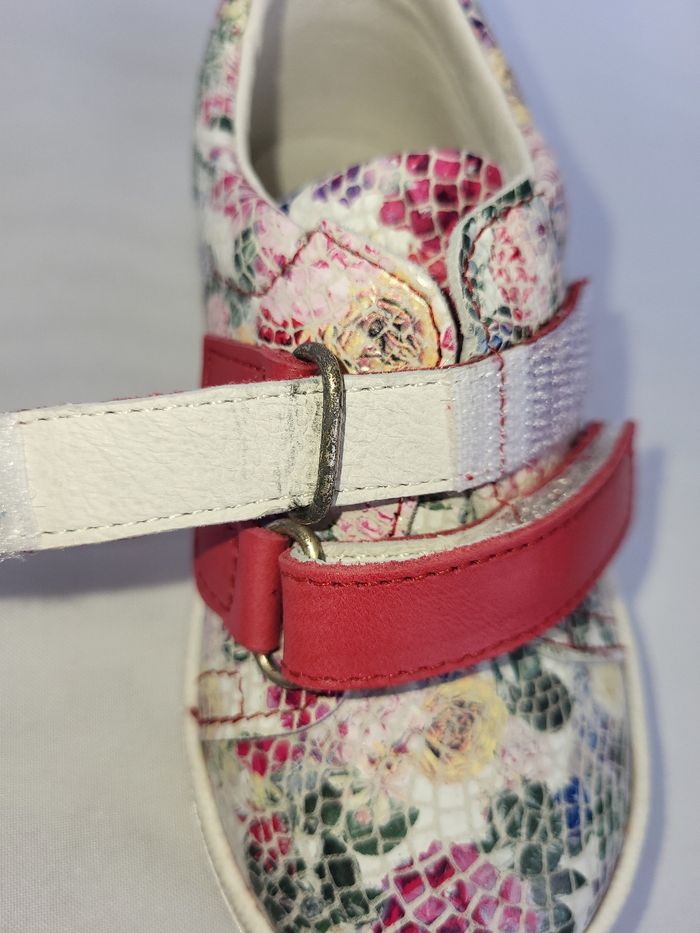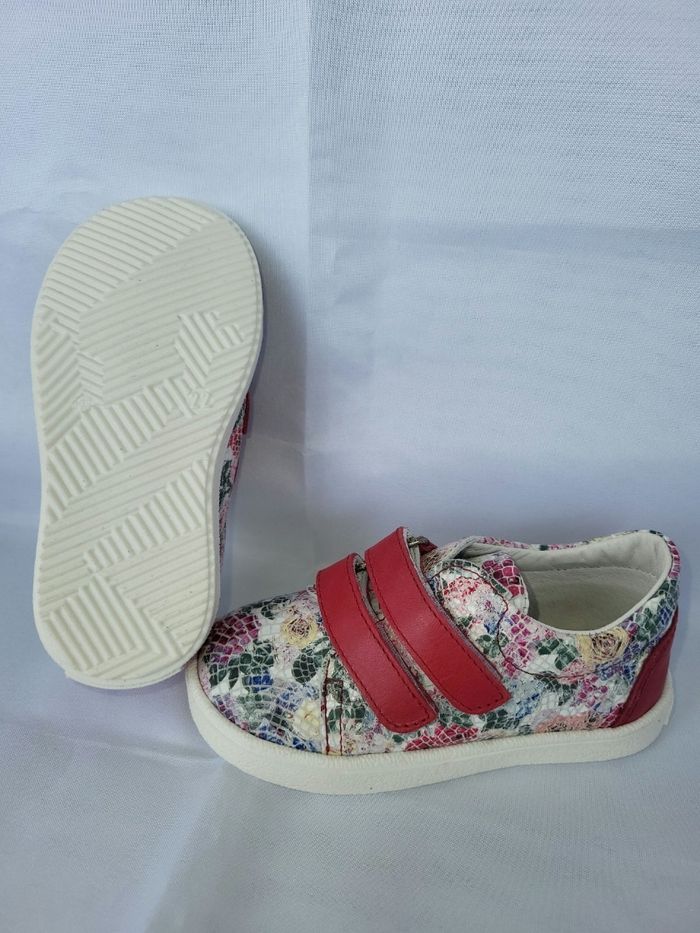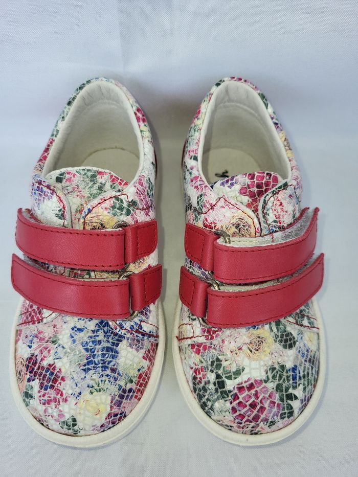 Chaussures style tennis de très belle qualité, tout en cuir souple imprimé fleurs, doublure et semelle intérieure en cuir blanc, de la marque française Patt'touch, entièrement dessinées et fabriquées dans le sud-ouest de la France