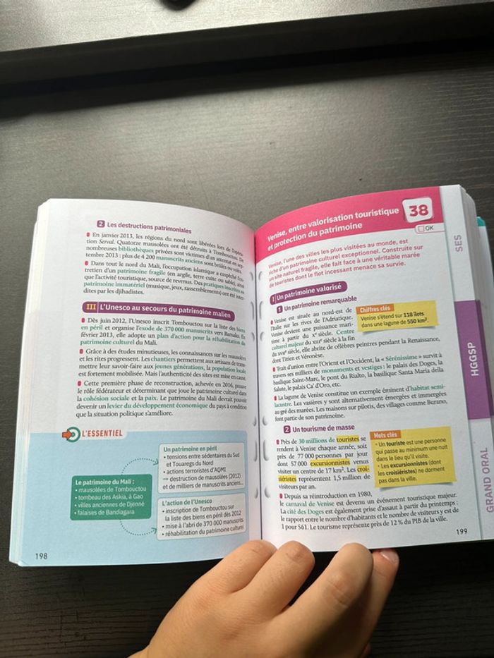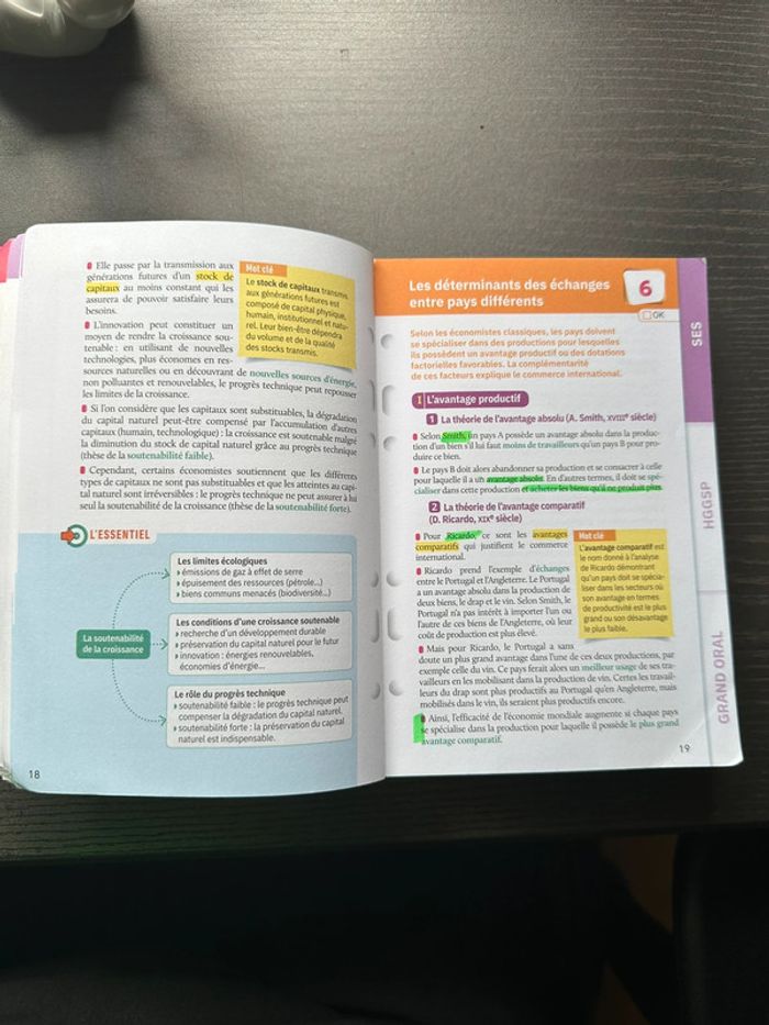 Spécialités HGGSP SES Livre ouvert, deux ou trois pages sont surligneurs comme sur la dernière photo mais c’est tout. Livre en très bon état.