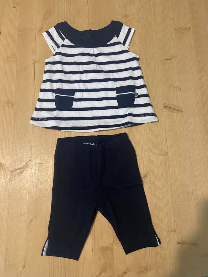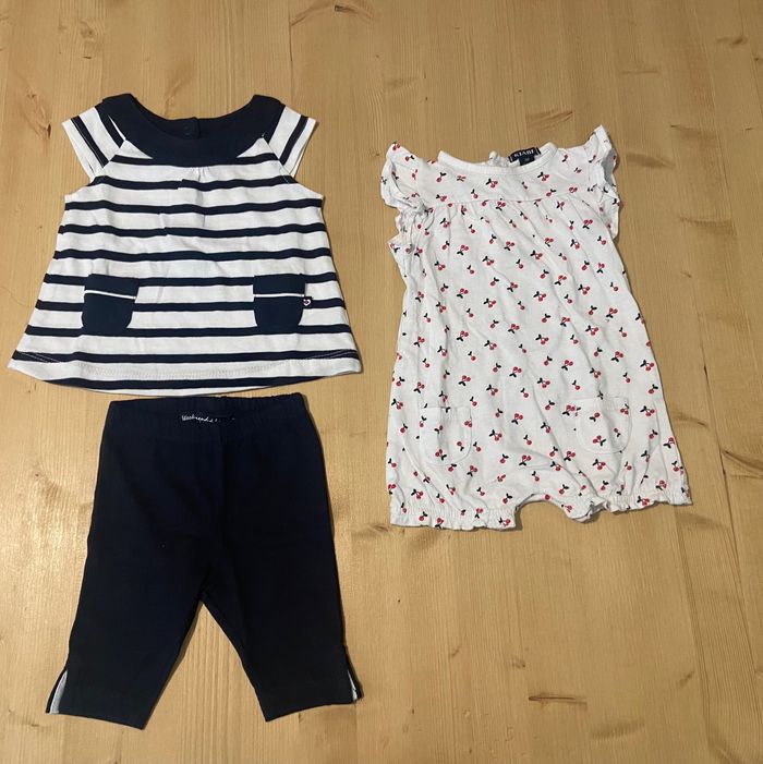 Bonjour 🌸 Je vend un lot de vêtements taille 3 mois, en parfait état. Il se compose de : - 1 ensemble. Marque "week end à la mer" - Une combishort "KIABI" Je vend le lot, ou à l'unité N'hésitez pas ! Belle journée ☀️ PS: Je vend des vêtements de 1 mois à 24 mois
