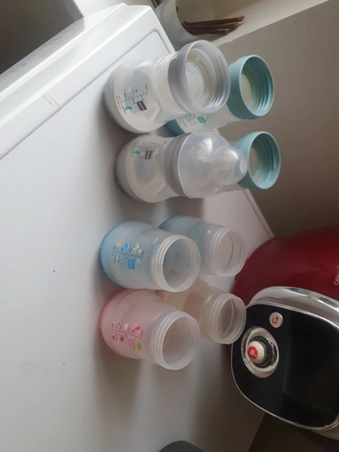 Lot de 8 biberons mam 160 ml Vendus sans les tetines Tous les bouchons sont présents Les 4 de droite sont un peu plus vieux les valves sont donc un peu plus jaunies