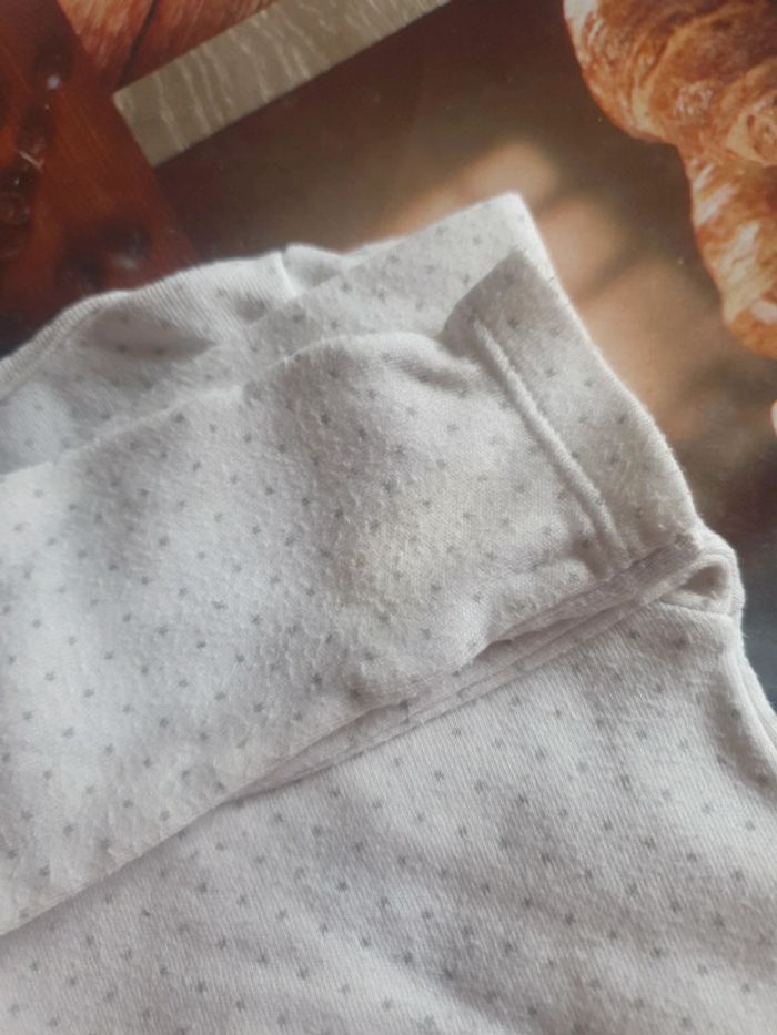 Pressions devant Fin 1 tache de lait sur le bout d une manche Le bout des manches se replie sur les mains pour éviter les griffures