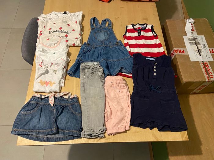 Bonjour 🌸 Je vend un lot de 14 vêtements taille 18 mois, en parfait état. Il se compose de : - 2 pyjamas - 3 t-shirts manches courtes - 1 t-shirt manches longues - 2 robes - 1 jupes - 2 pantalons - 1 combishort Je vend le lot, ou à l'unité N'hésitez pas ! Belle journée ☀️ PS: Je vend des vêtements de 1 mois à 24 mois.