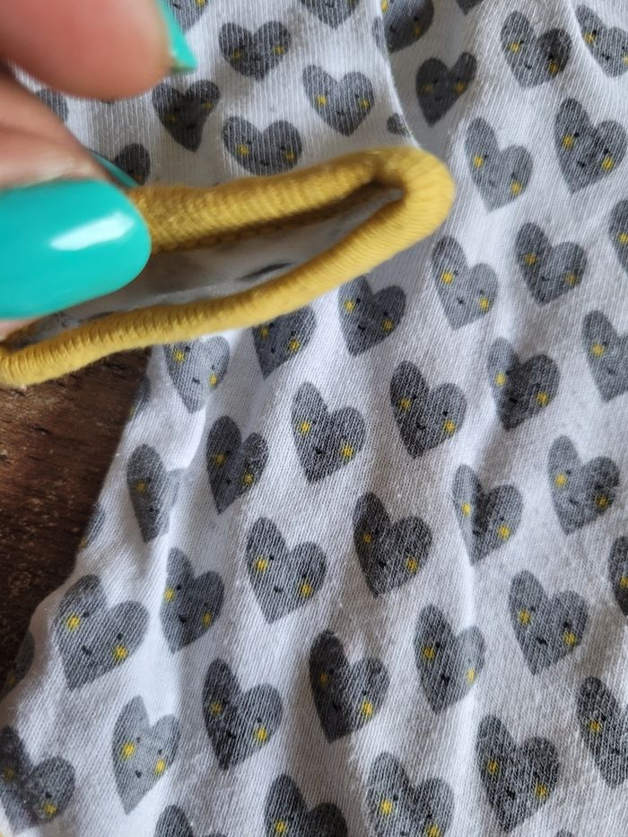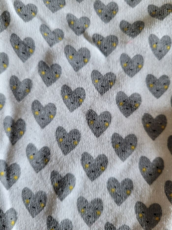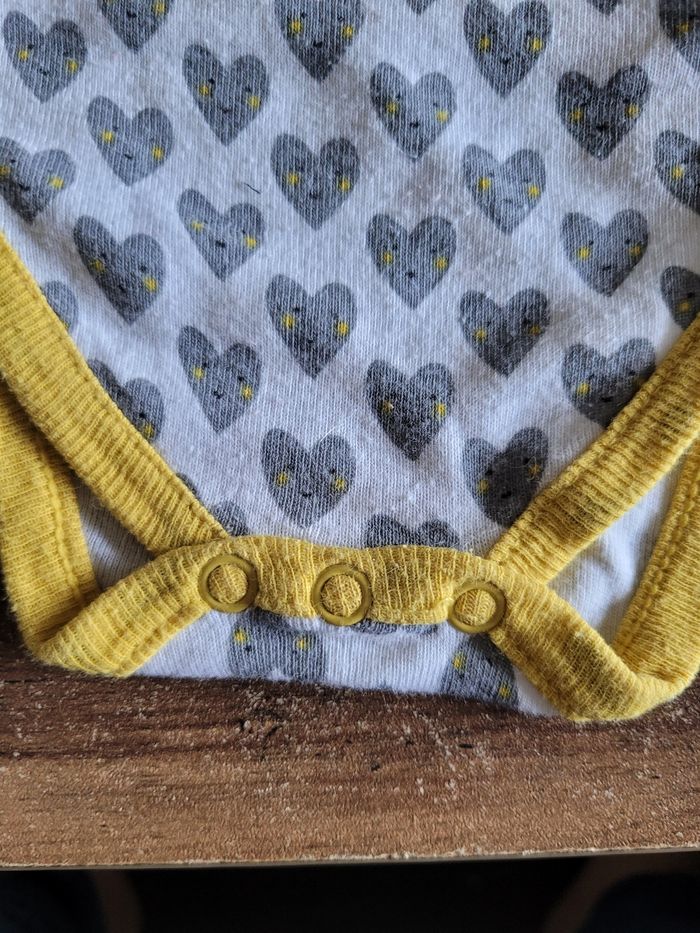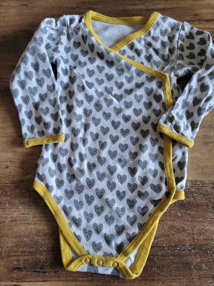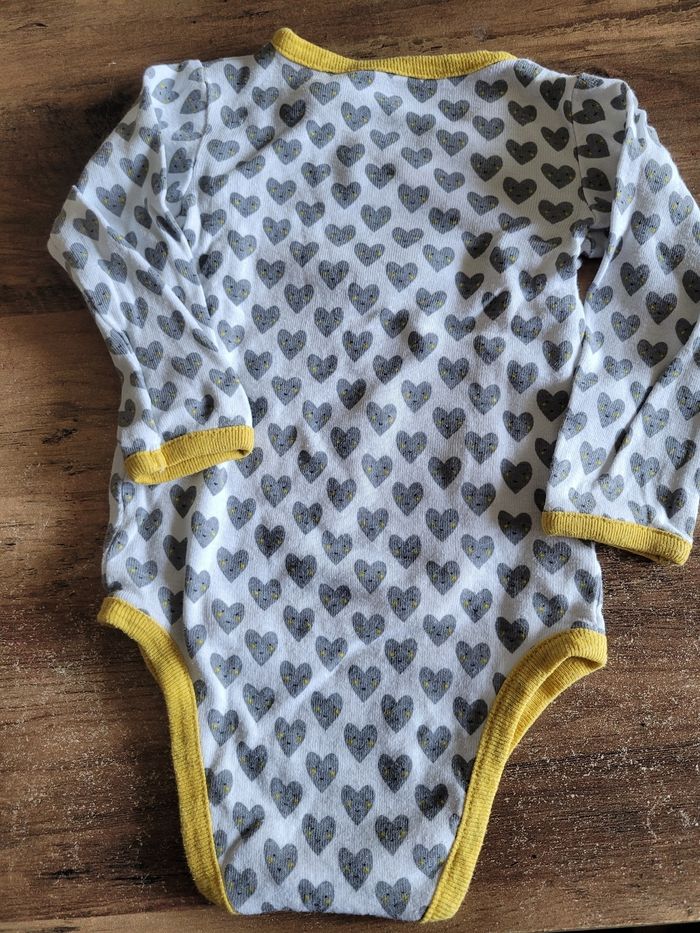 Petit bodie Manche longue Taille 6 mois Couleur blanc et jaune Dessin cœur gris Mi saison Attaché devant Matière 100% coton Mixte