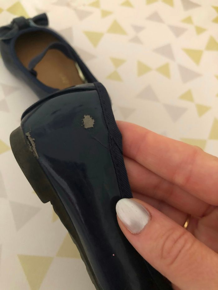 Ballerines Primark taille 23 vernis bleu marine. Deux accros sur le devant et l’arrière (cf photos) mais encore portables.