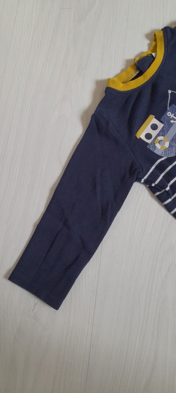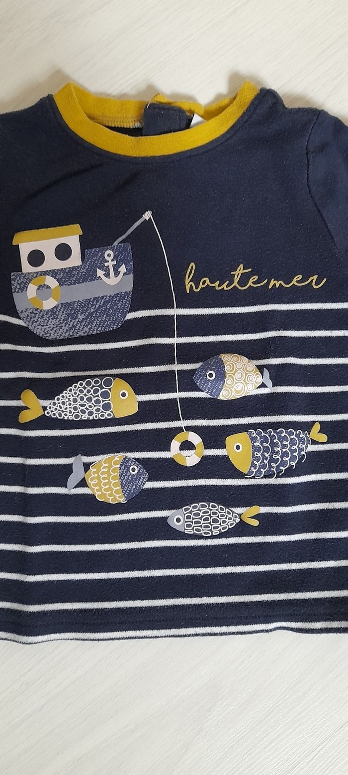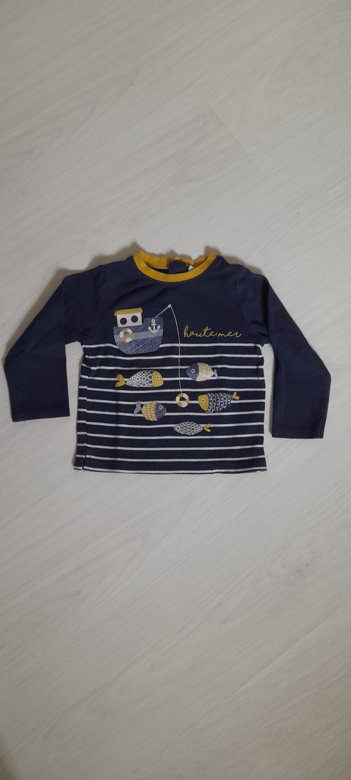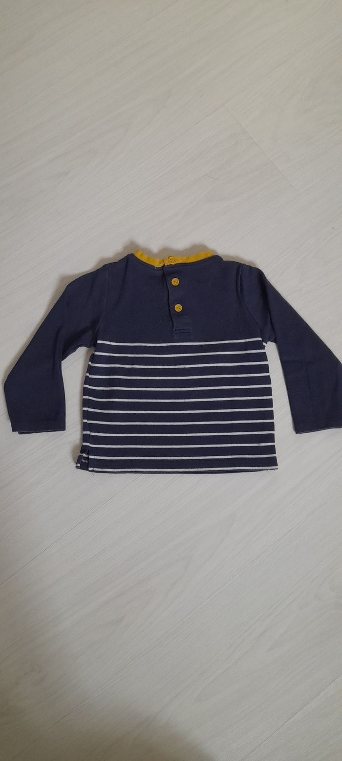 Tee-shir manches longues T 23 mois Couleur bleu marine/ bandes blanches et col ocre Attache boutons sur arrière cou Motif devant 1 bouton de rechange 60% coton/ 40% Polyester Très très bon état