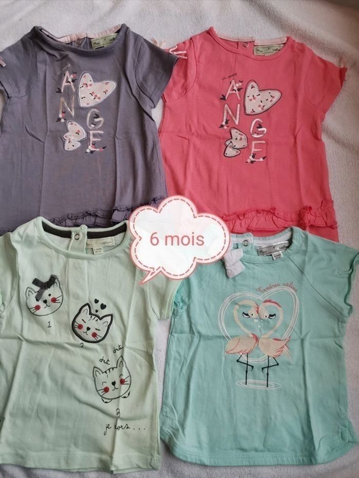 Lot de 4 tee shirt de mes petits cailloux en 6 mois ou 68 cm. Tee shirt manches courtes avec pression en haut du dos. Motifs différents. Possibilité de séparer le lot. En très bon état.