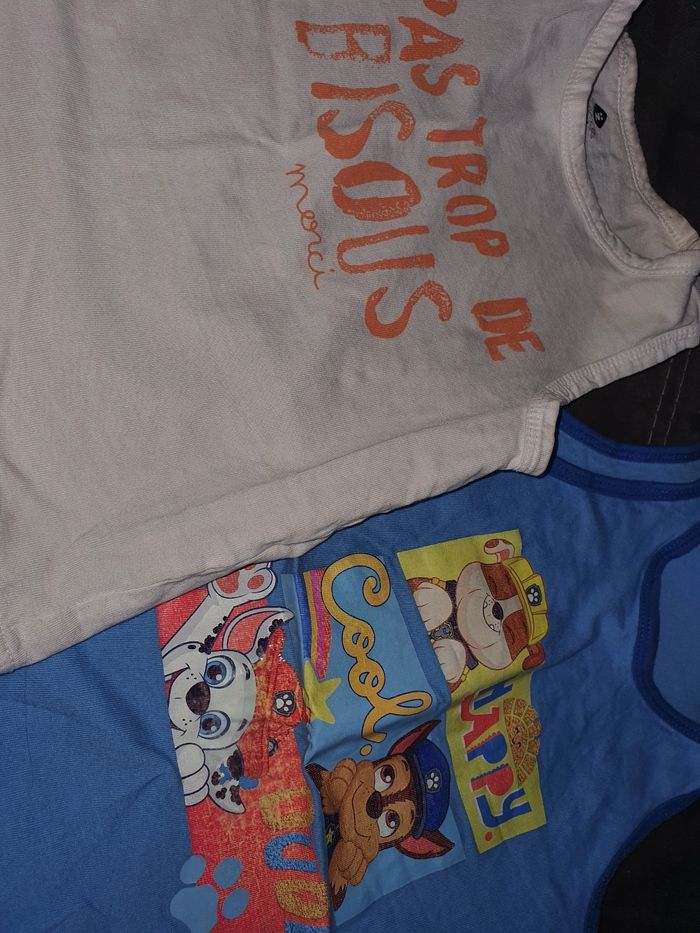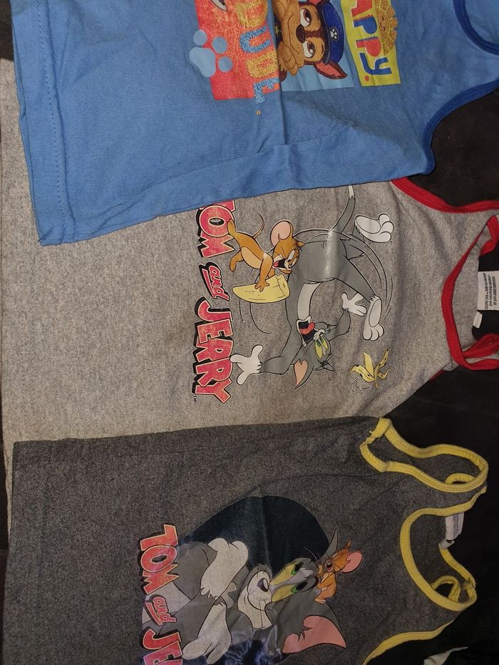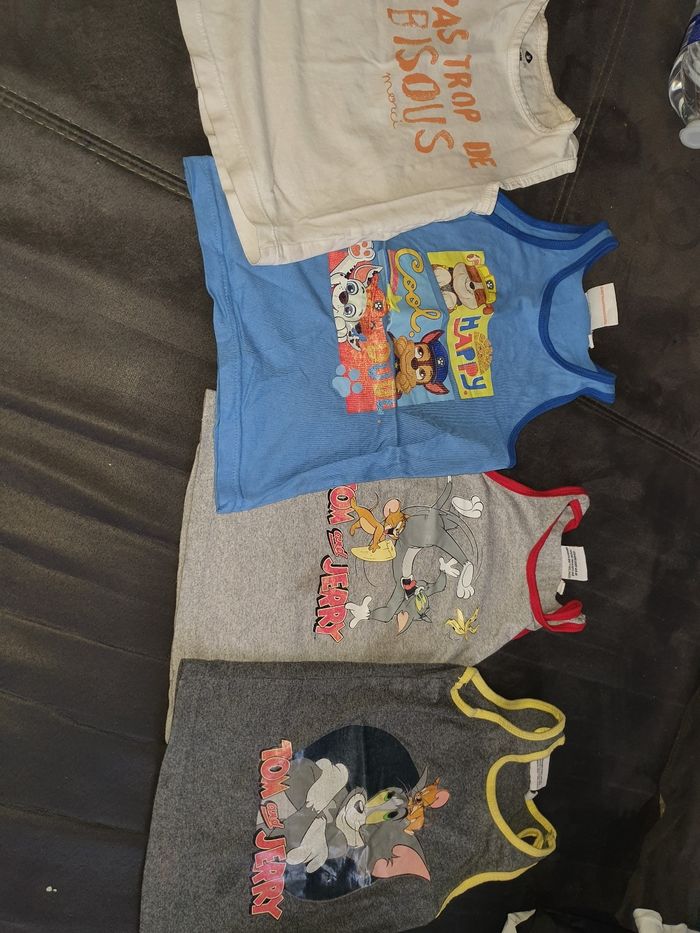 Lots de 4 débardeurs 2 Tom et Jerry un pat patrouille et un humour. Image un peu abîmer du au lavage mes rien de méchant. Peu être vendu séparément