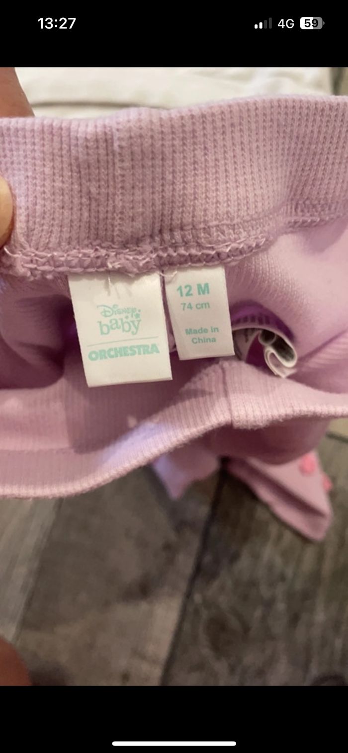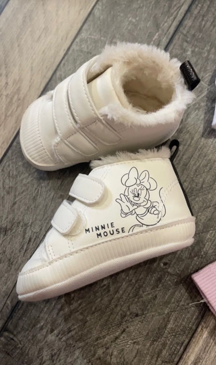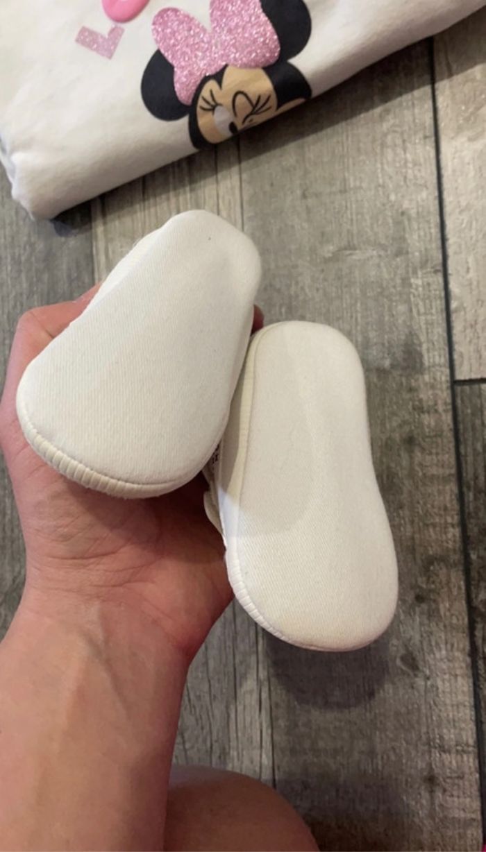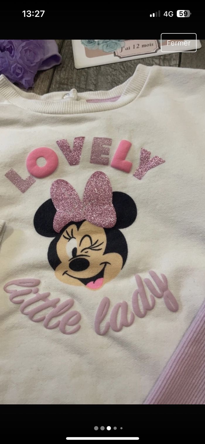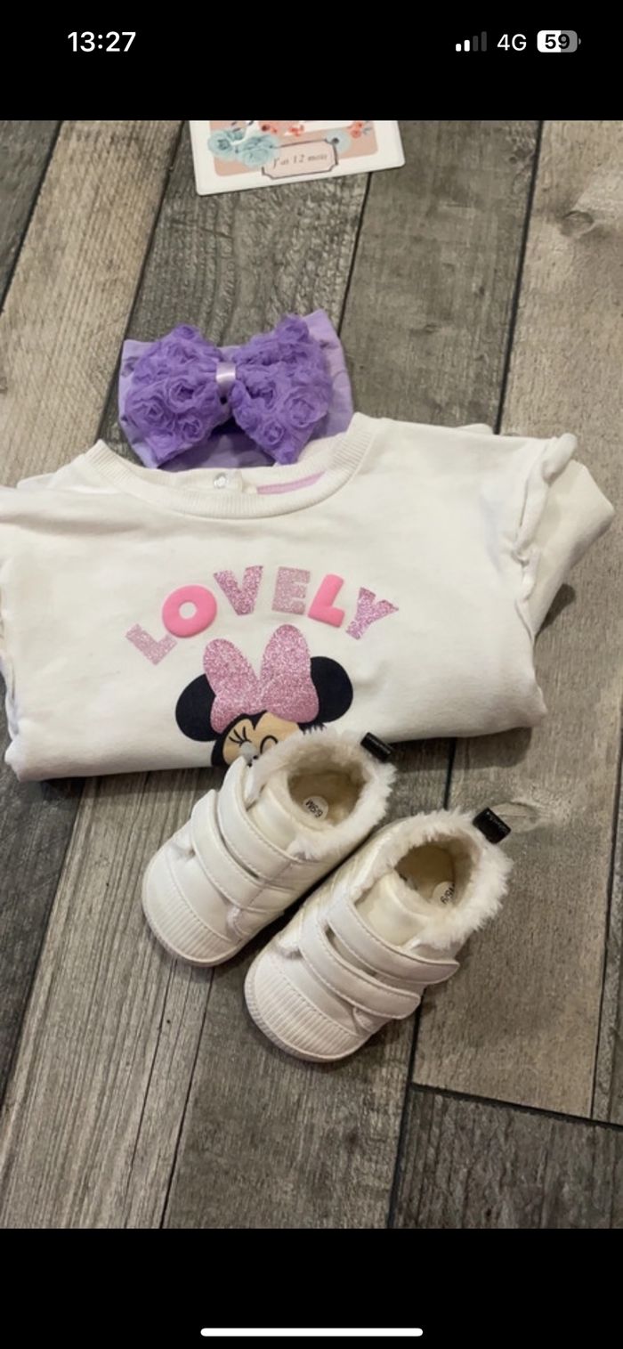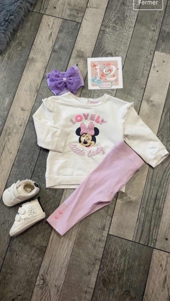 Jolie ensemble disney comprenant Pull/legging/chaussures/ruban Très très bon état 12 mois Pull pailletée legging avec bouton tête de minie Ruban fleur Chaussure chaude