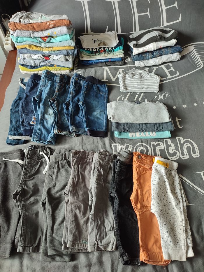 Gros lot hiver bébé garçon 9 mois 12 pyjamas 8 t-shirts manches longues 3 gilets 3 pulls 1 veste en jean 1 body manches longues 6 jeans bleus (tous différents) 5 pantalons gris et un noir (tous différents) Je donne 2 autres pantalons avec (un orange et un Winnie kia