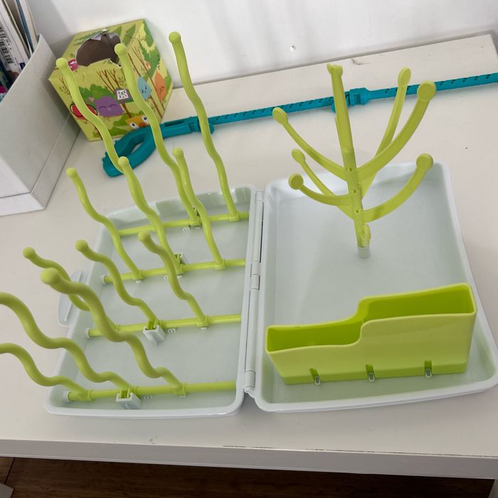 Egouttoir biberon transportable comme une petite malette qu’on peut prendre partout avec en très bon état de couleur blanc et vert de chez formula baby grande capacité pour plusieurs biberon ainsi que vaisselle bébé