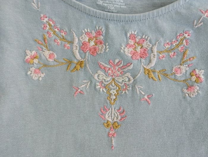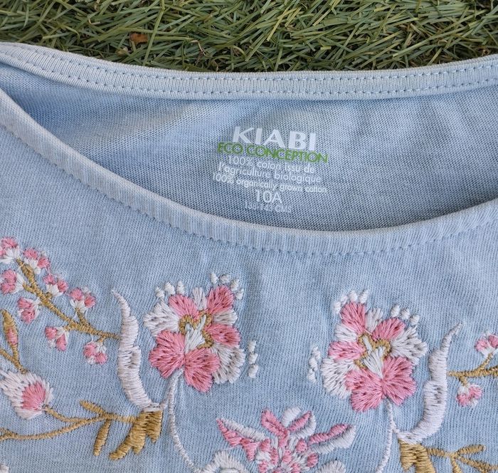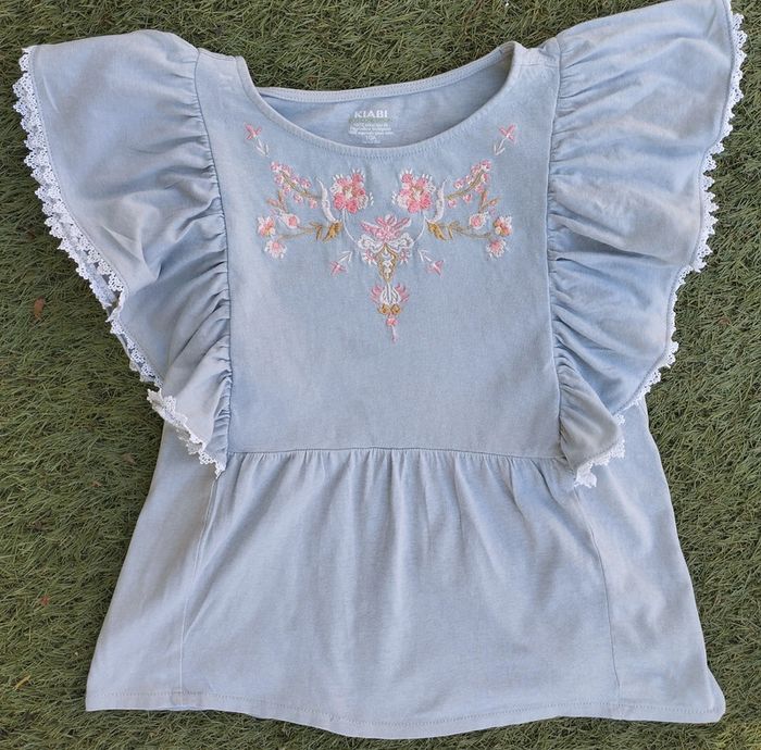 Beau petit tee-shirt vert tendre brodé, manches froufrous avec dentelle. Marque Kiabi Taille 10ans. Très bon état Pensez à regarder mes autres ventes, beaucoup de marques à petits prix et toutes tailles.