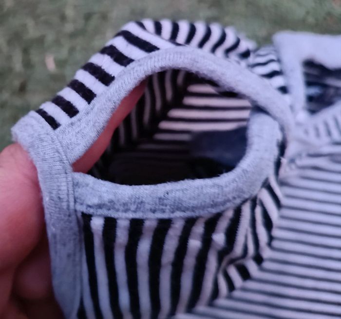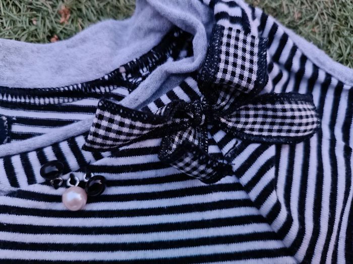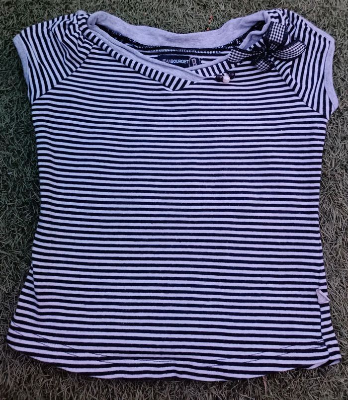 Joli petit tee shirt rayé gris et noir avec petit fantaisies sur le col et ouverture au niveau des manches Marque Jean Bourget Taille 4ans. Bon état Pensez à regarder mes autres ventes, beaucoup de marques à petits prix et toutes tailles.