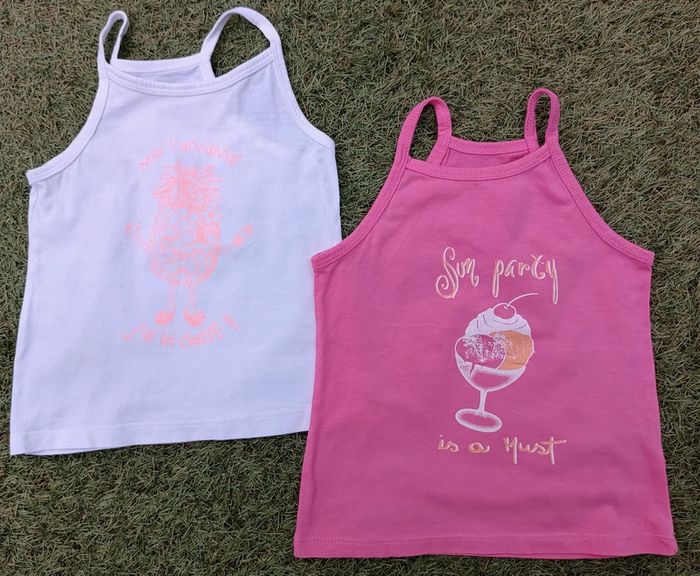 Lot de deux petits débardeurs Marque Tout simplement Taille 3ans Très bon état Pensez à regarder mes autres ventes, beaucoup de marques à petits prix et toutes tailles.