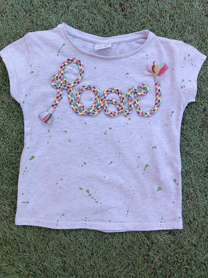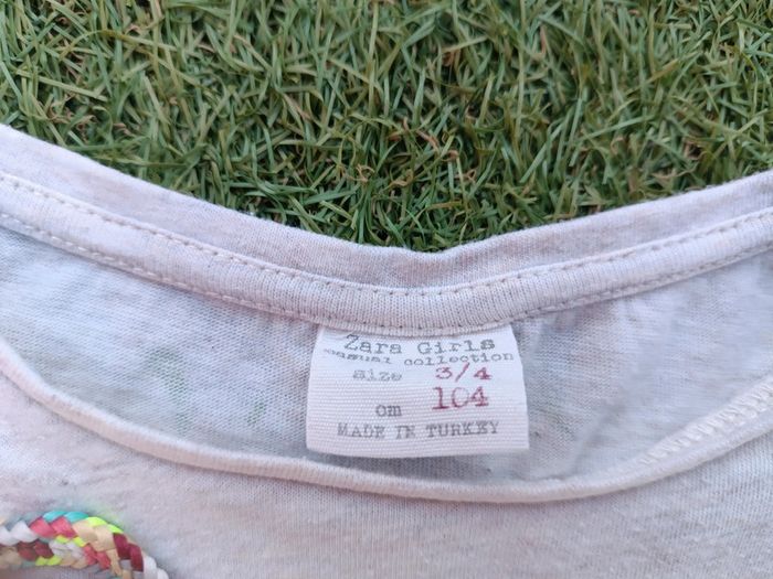 Beau petit tee shirt écru à points verts et inscription brodée sur la poitrine. Marque Zara Taille 3/4 ans. 104 cm Bon état Pensez à regarder mes autres ventes, beaucoup de marques à petits prix et toutes tailles.