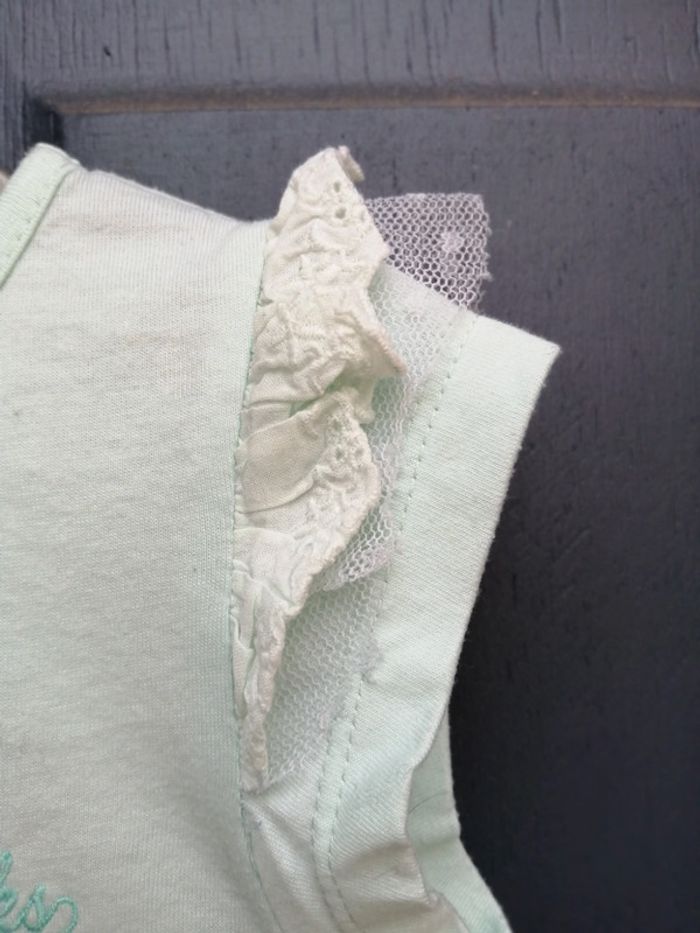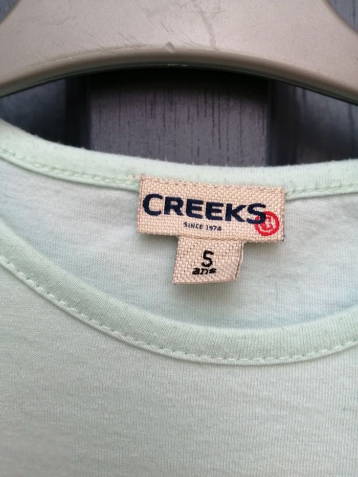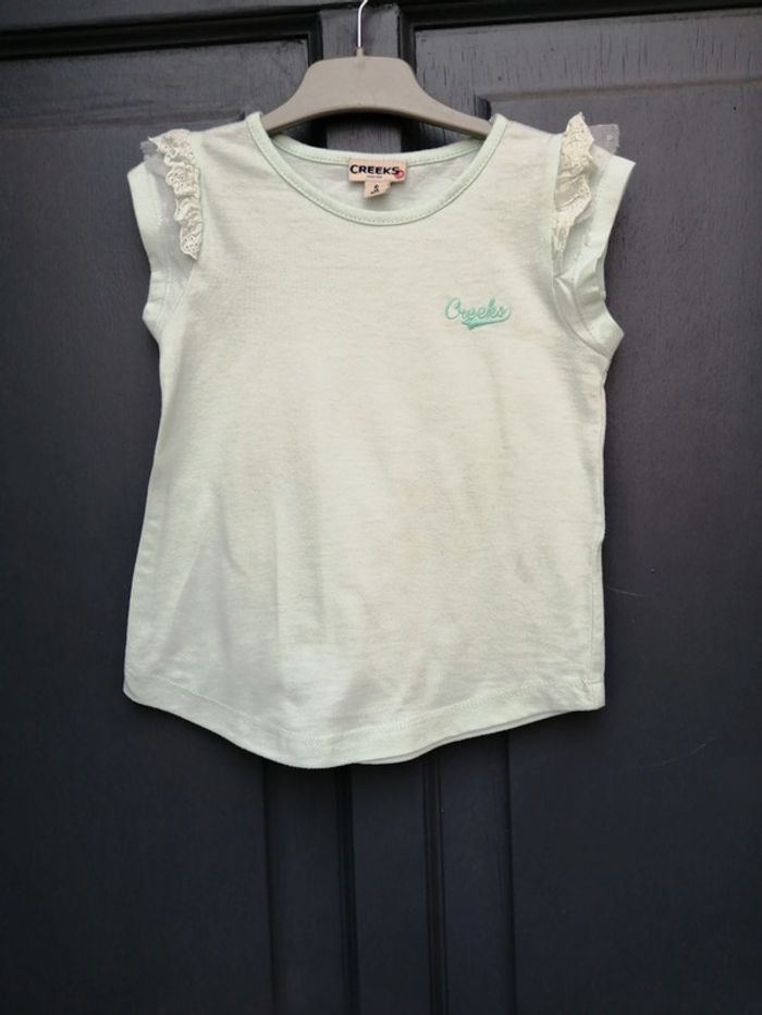 Beau petit tee shirt, beau petits détails sur les épaules Couleur vert d eau Marque Creeks. Taille 5ans Tres bon état Pensez à regarder mes autres ventes, beaucoup de marque à petit prix et toute taille.