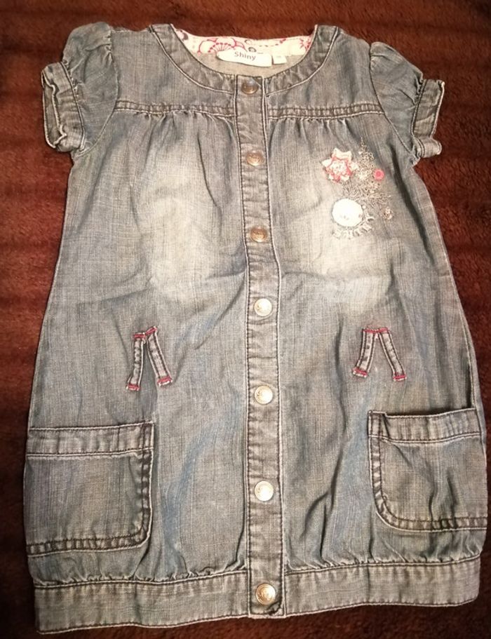 Belle petite robe en jeans, super mignonne passe partout. Petite broderie sur la poitrine Marque shiny Taille 3ans Bon état Pensez à regarder mes autres ventes, beaucoup de marques à petit prix et toutes tailles.