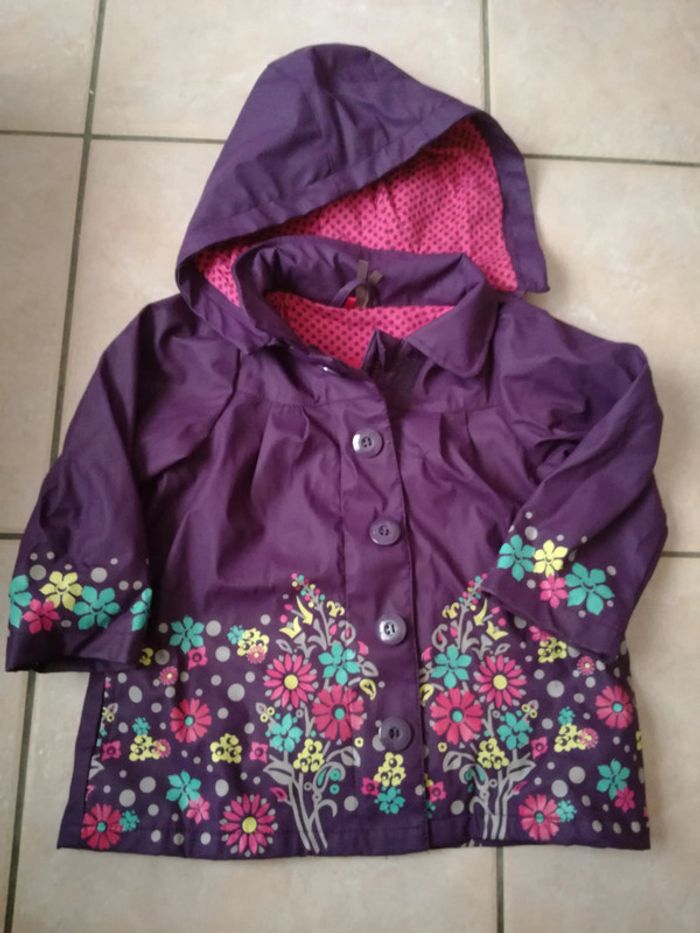 Mignon imperméable orchestra doublé. Capuche amovible Impression de fleurs dans le dos également 2 ans, bon état.