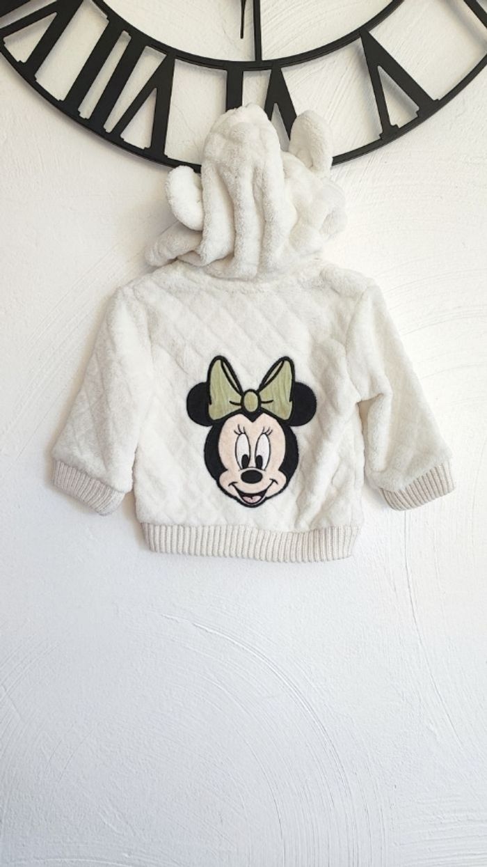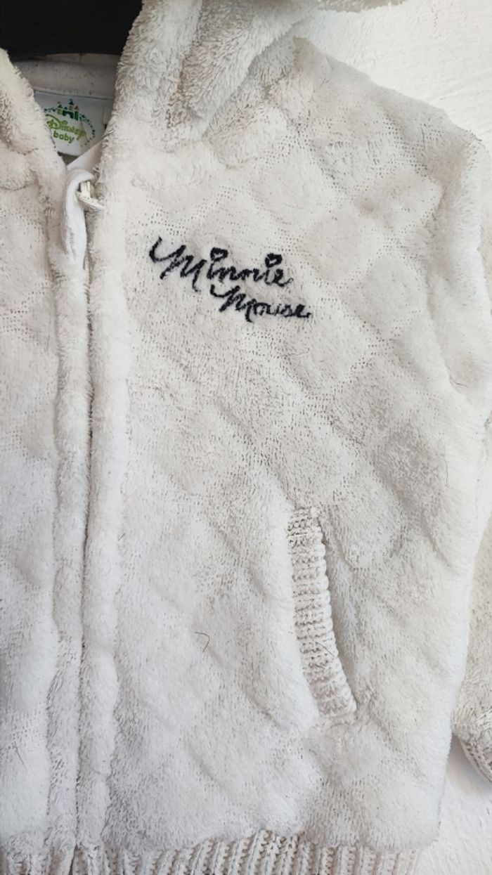 Veste polaire blanche minnie a capuche avec oreilles. Toute douce. Se ferme avec une fermeture éclair. 100% polyester et doublure 100% coton De la marque Disney En taille 3 mois En très bon état / maison non fumeur #laetitia33700filletroismois