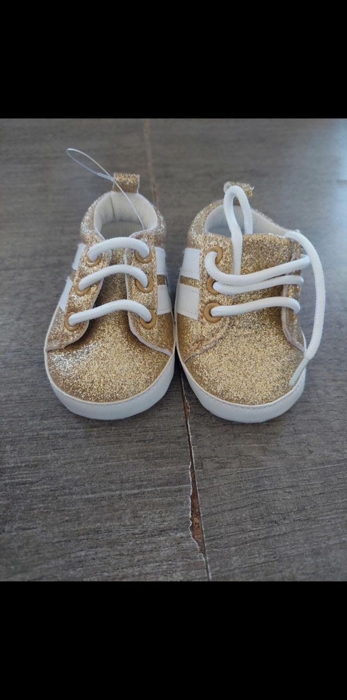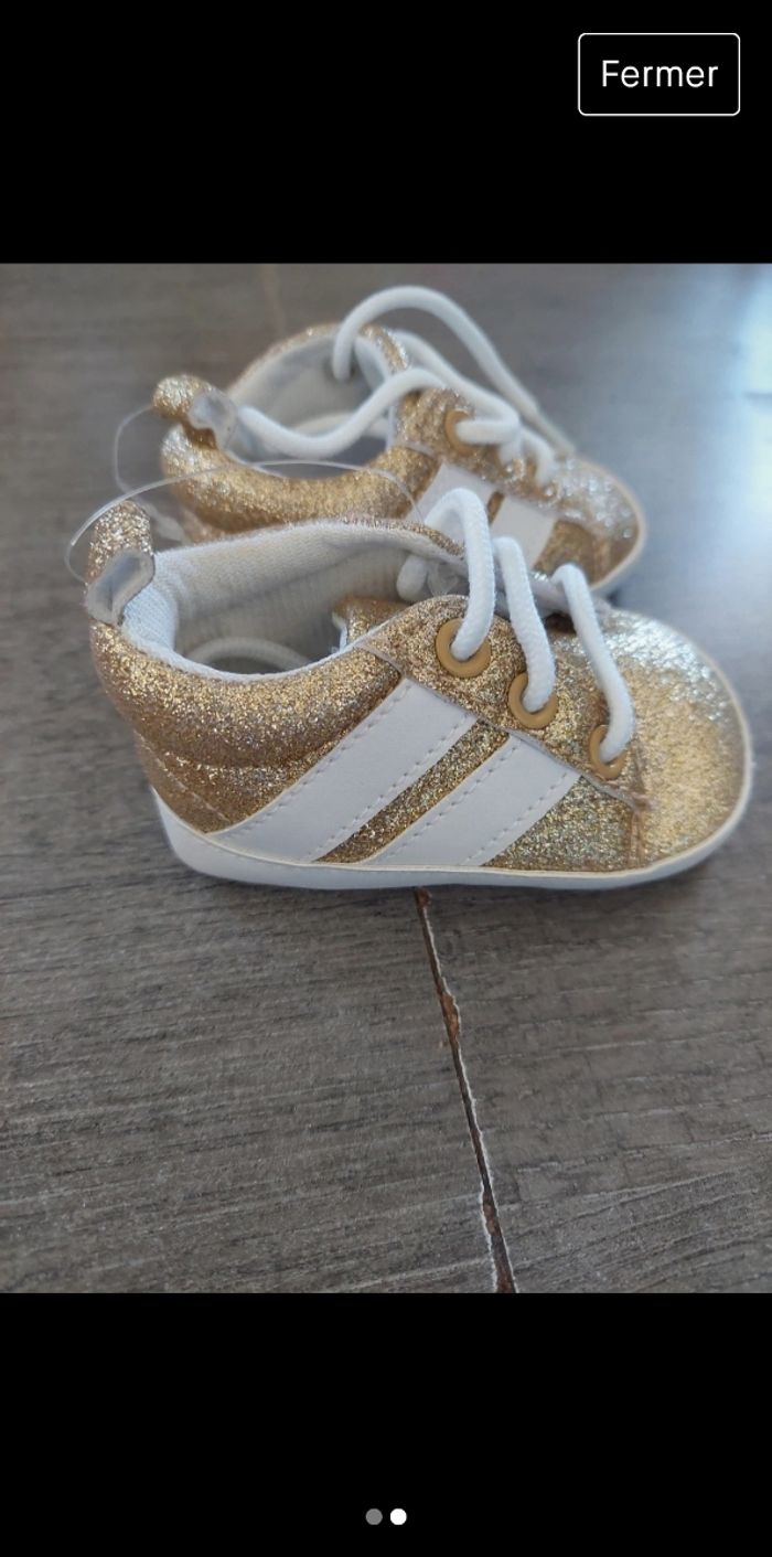 Jolie chaussure souple doree. Très bon état. Jamais mise Longueur pied 10 cm