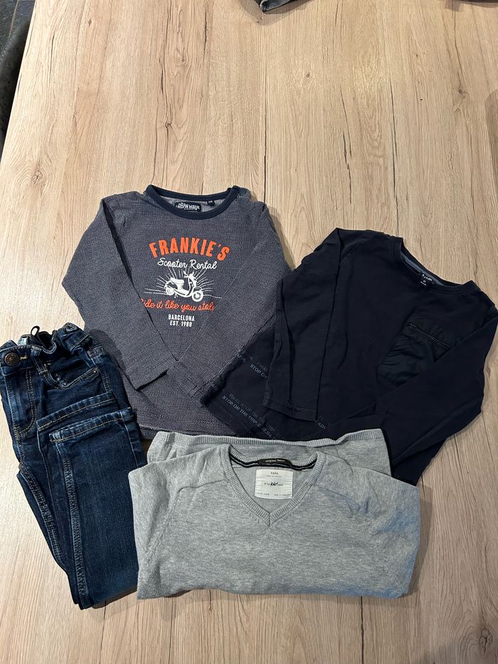 1 pull Zara 2 t shirt 1 jeans ( effet sur les genoux n’est pas de l’usure mais d’origine) Parfait état