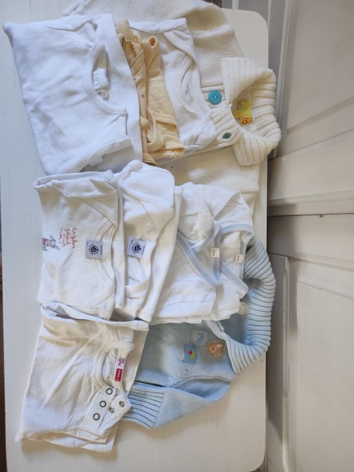 Lot comprenant : - 2 bodies Petit Bateau ( 1 Mc et 1 ML) - 2 bodies fermeture sur le côté ML - 1 t-shirt ML blanc + 1 t-shirt DP AM ML - 2 bodies Tex MC - 1 body ML jaune pâle