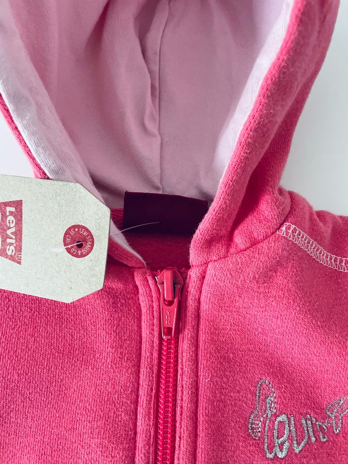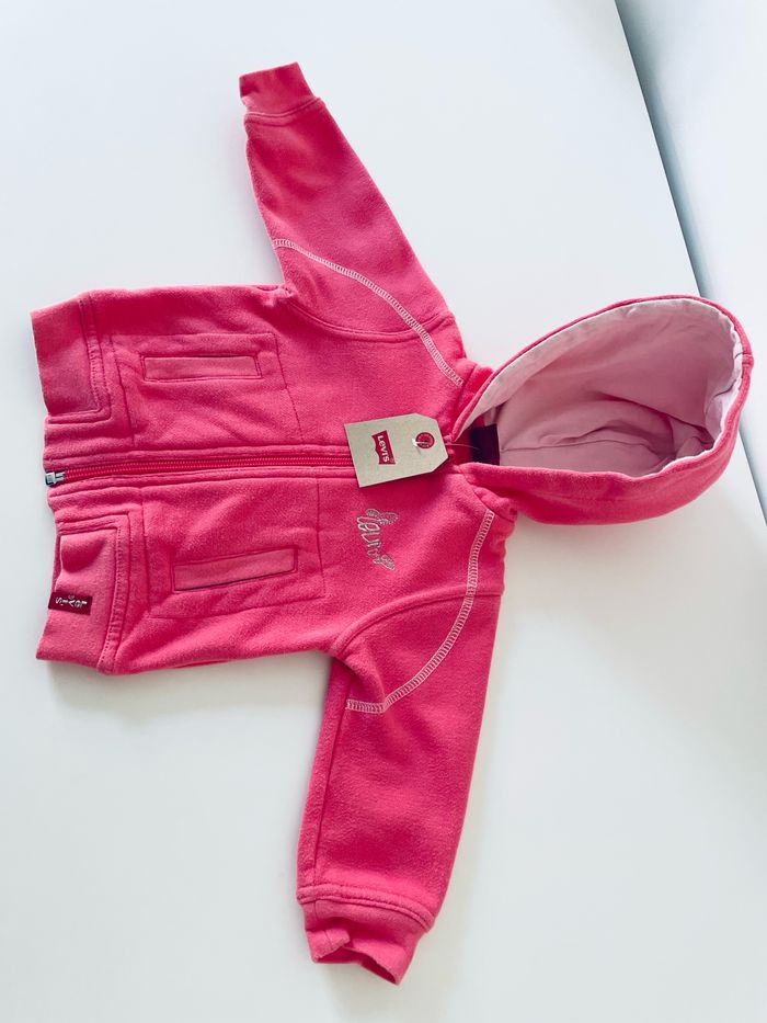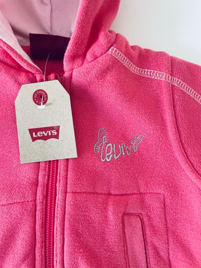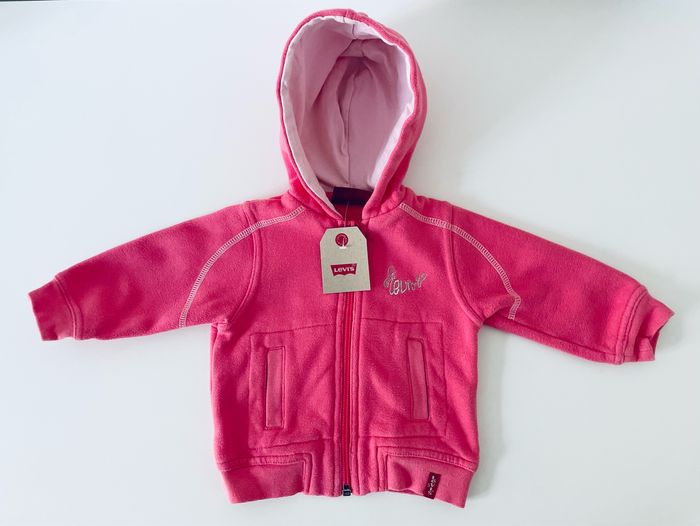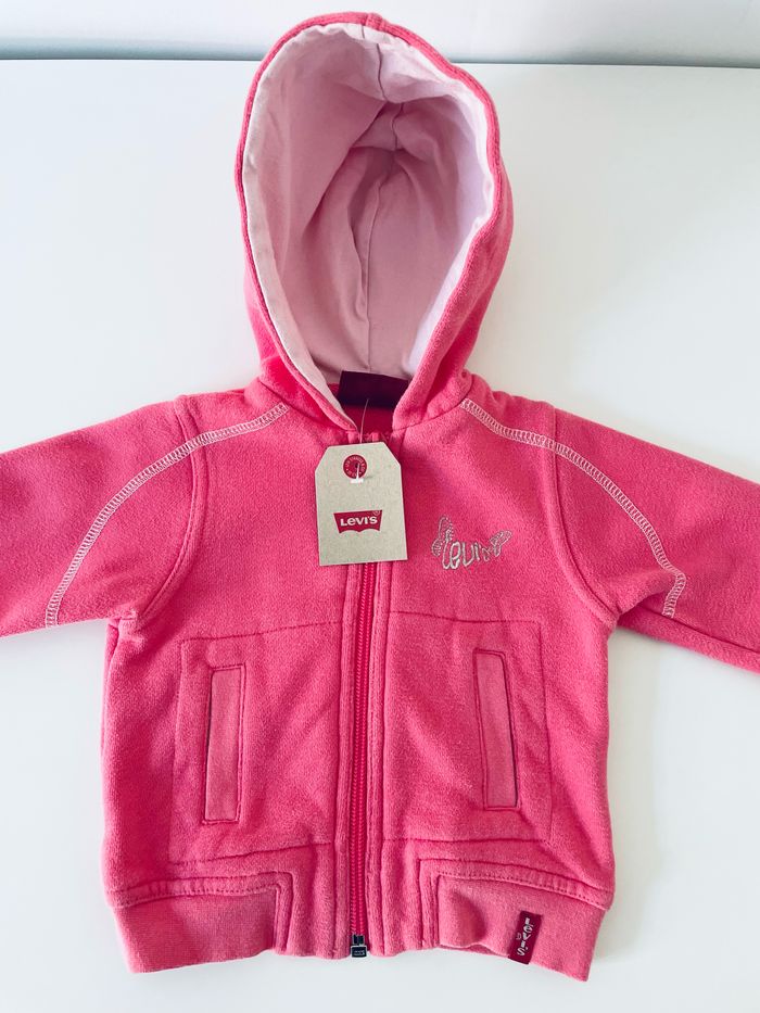 Magnifique veste à capuche zippée Levi’s, taille 6 mois. Article neuf avec étiquette mais matière qui peluche un peu d’où le prix très bas par rapport au prix d’achat.