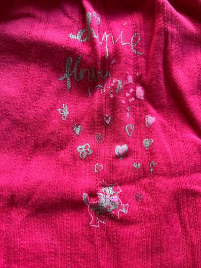 Motifs coeurs devant. Dos uni. Coupe large. Le col est élastique et froncé. Composition 100% coton.