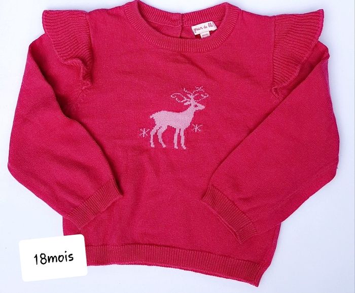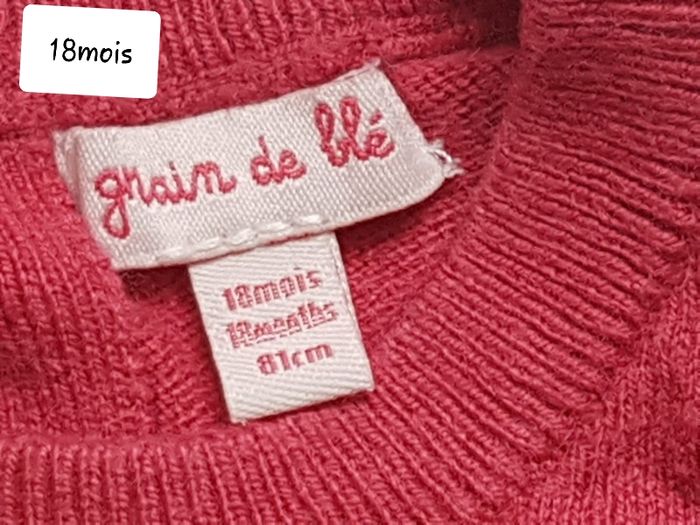 Petit pull marque "grain de blé ". 18mois. Couleur framboise. Sur les épaules des petits volants. excellent etat. Remise si lots. Négociation possible.(Si raisonnable ).hésitez pas a me contacter pour plus de renseignements, photos, mesures....