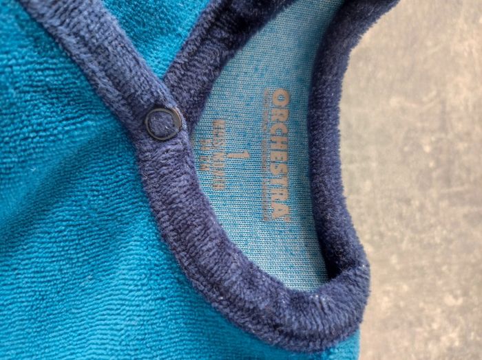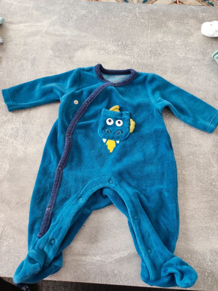 Pyjama orchestra 1 mois 54 cm, attention les petits yeux de dragons sont un peu usés voir sur la photo. Pas de tâches pas de trous, en bon état.