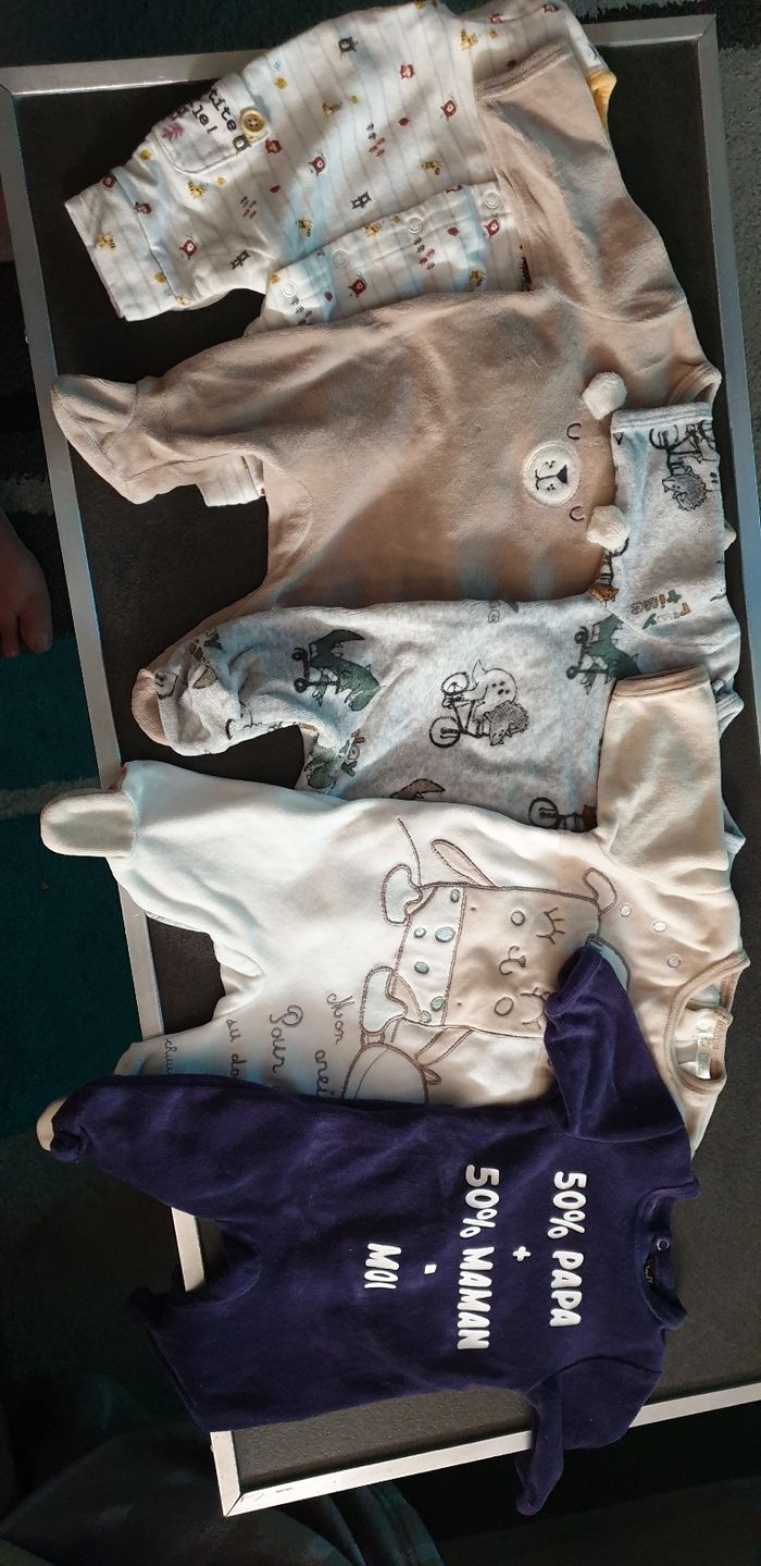 10 pyjamas et 10 bodys 1 mois Certains n'ont pas été portés seulement lavés. Mon bébé a grandit trop vite 😊