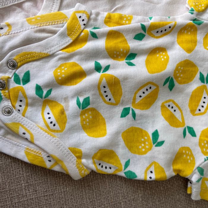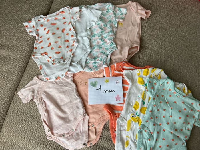 Lot 10 bodies 1 mois. Un des bodies est taché ( voir photo) Plusieurs marques ( Kiabi, Manor, Amazon…)