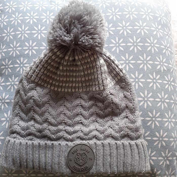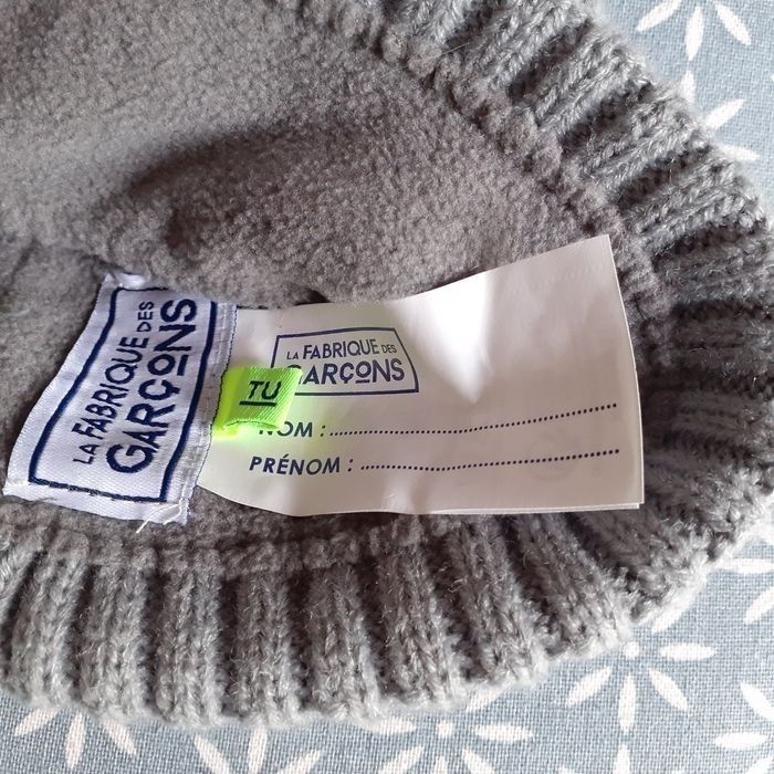 Bonnet avec pompon, coloris gris et blanc; marque " La fabrique des garçons"; Badge en plastique devant, motif Tigre. Étiquette en intérieur pour coordonnées. Extérieur 100% acrylique, doublure 100% polyester; lavable à 30°. Taille unique/garçon // voir photos personnelles pour détails