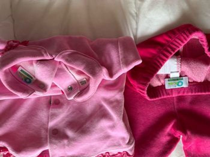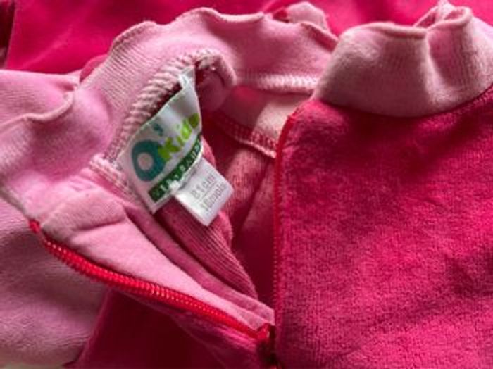 Robe et ensemble en velours. Manches longues. Fermeture par zip au dos pour la robe. Patte de boutons pression au dos pour le haut. Pantalon taille élastique. Col rond pour la robe et Claudine pour le haut. 2 couleurs : rose pour les manches et fuschia pour le devant et le dos. Matière 100% coton.