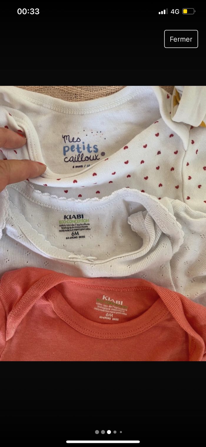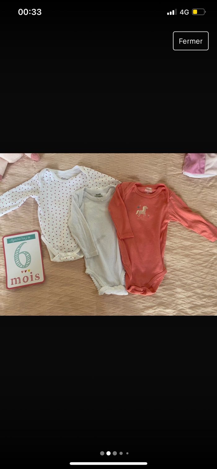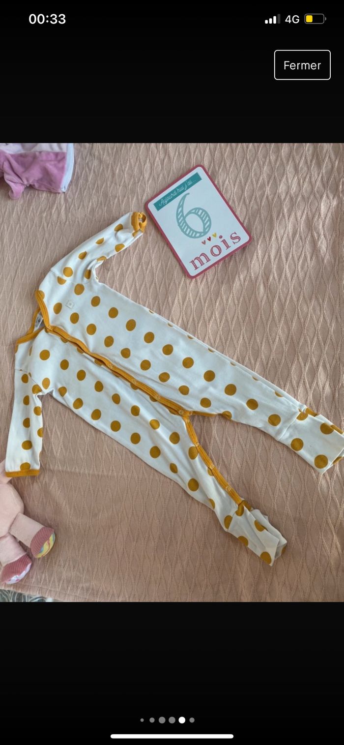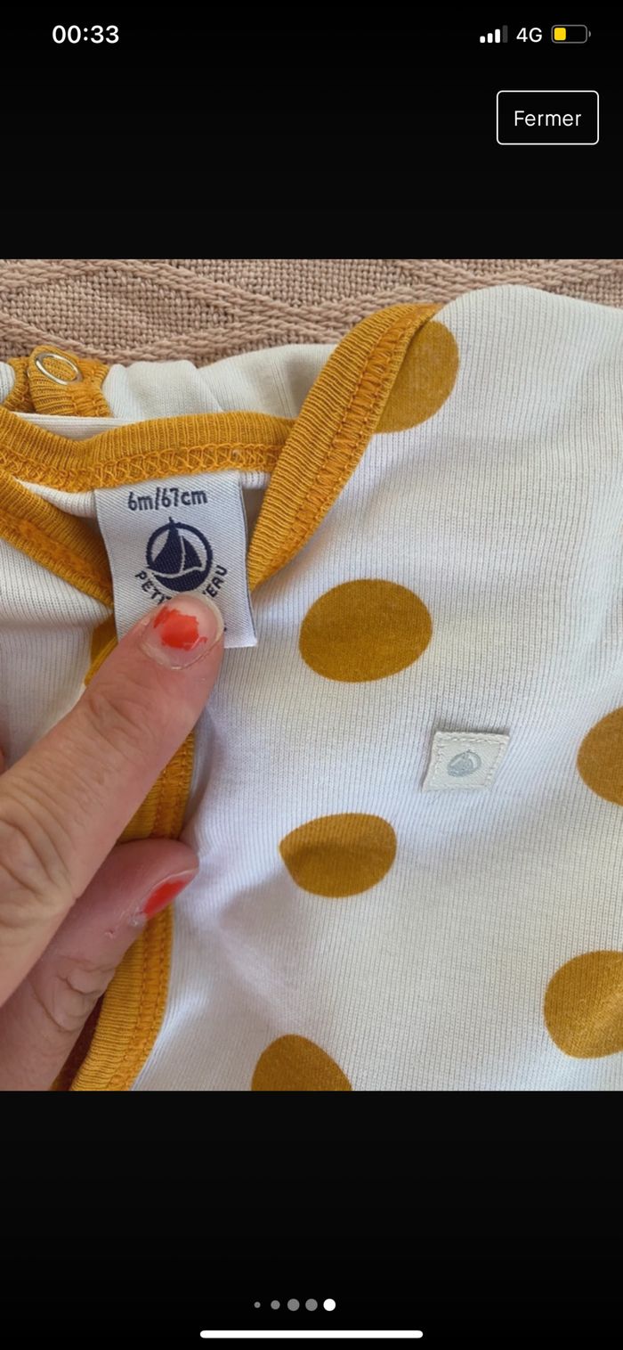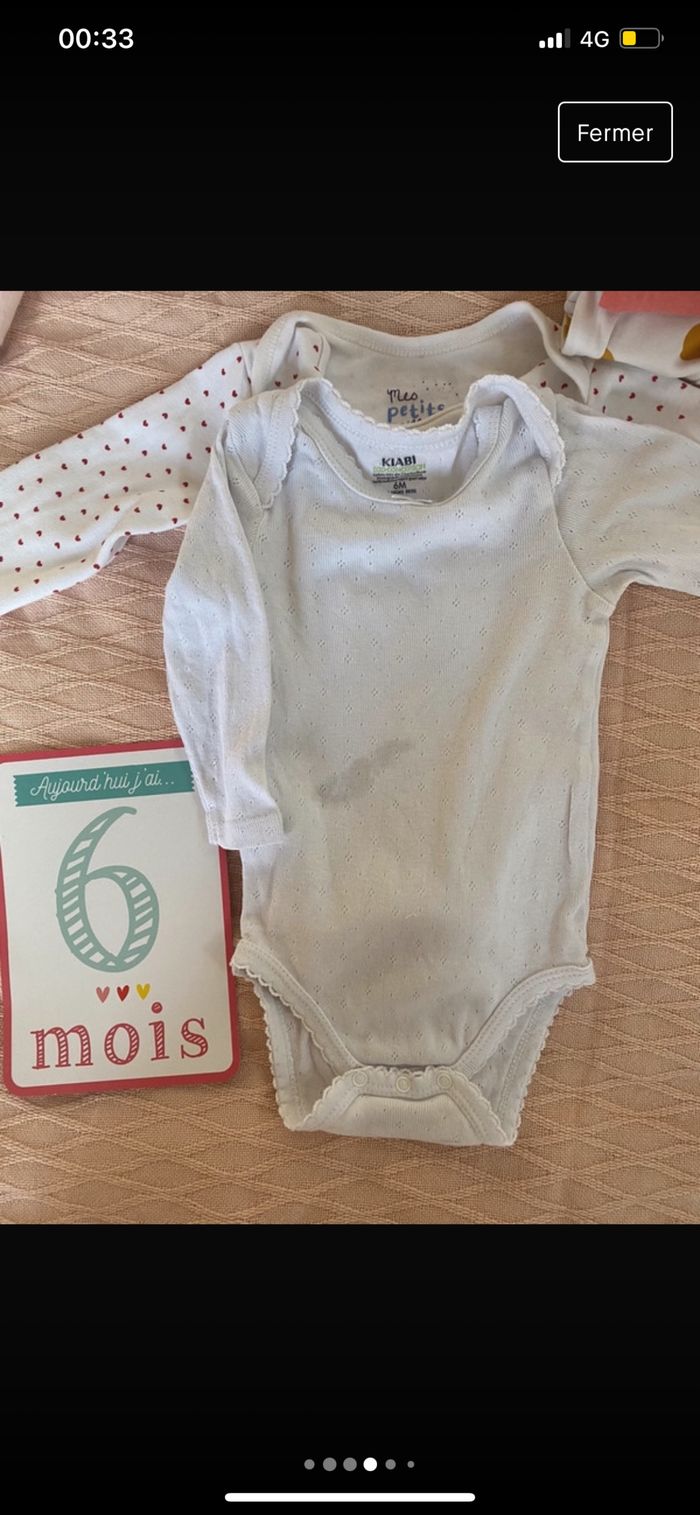 1 pyjama petit bateau 2 bodies Kiabi Dont le blanc 1 petite tache 1 bodies petit cailloux 6mois N’hésitez pas à vous abonner et à regarder mon profil, d autres vêtements lot sont en ventes Bonne visite ☺️