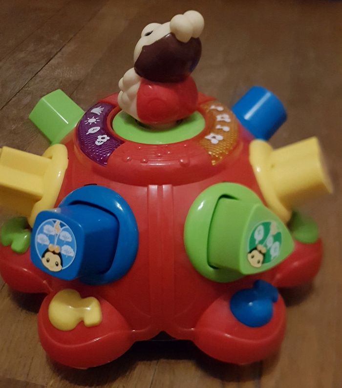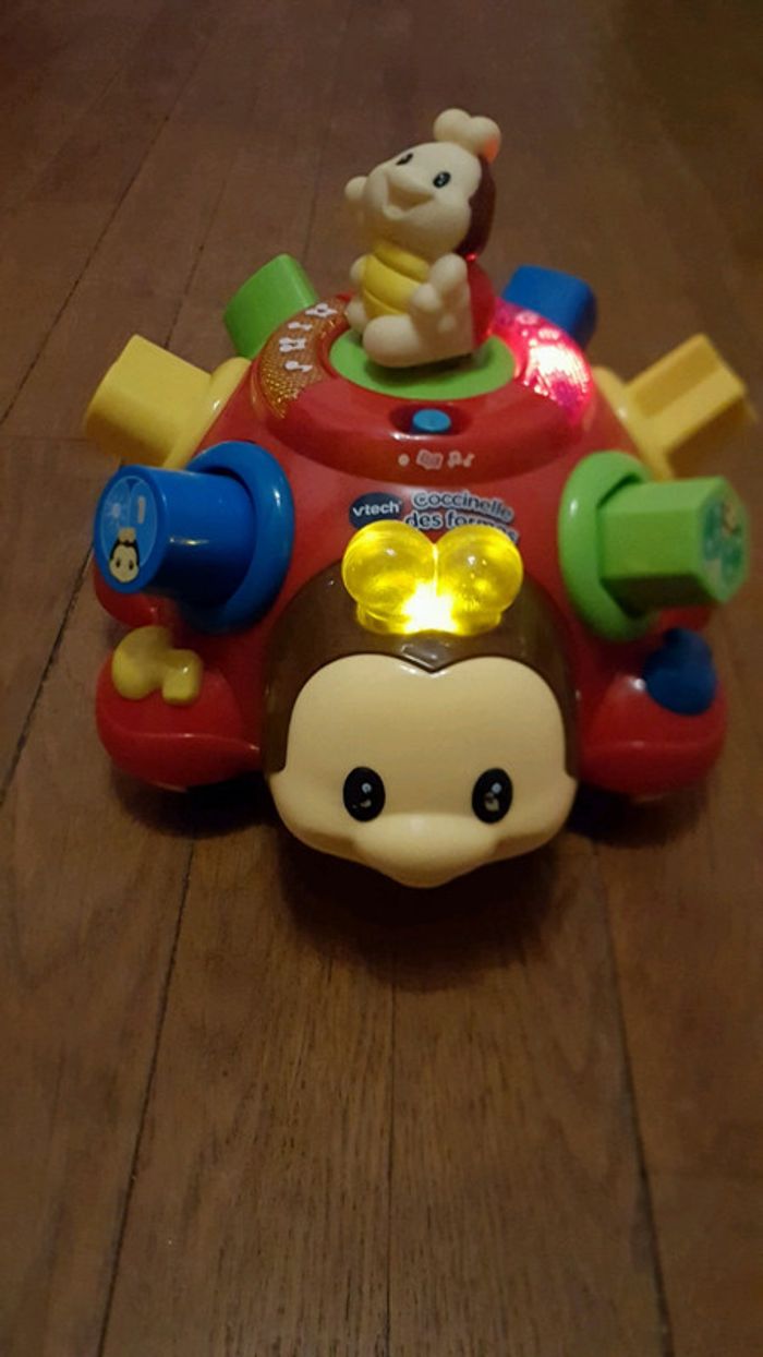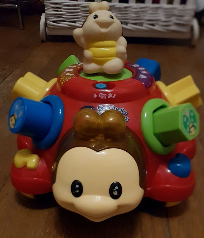 Idéal pour les enfants de 12 à 36 mois. Une coccinelle parlante et son bébé pour découvrir les formes ! Quand bébé appuie sur bébé coccinelle, toutes les formes insérées dans la coccinelle sautent pour la plus grande joie de bébé ! 6 formes colorées à encastrer pour apprendre les formes, les chiffres et le vocabulaire de la nature. En promenant la coccinelle grâce à son cordon, bébé fait tourner sur lui-même bébé coccinelle et déclenche des mélodies. 2 modes : découverte et musical. 2 chansons et 12 mélodies. Fournis avec des piles neuves Un seule petite usure sur les yeux, aucun stickers abîmés parfait état et complet.