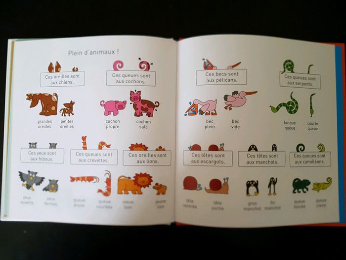 Ce petit livre est plein d'animaux. Des écureuils, des chats, des chevaux, des fourmis... Certains sont grands, d'autres sont petits. Chacun est un peu différent. Un livre amusant sur les animaux et les contraires, pour développer son vocabulaire, énigmes...
