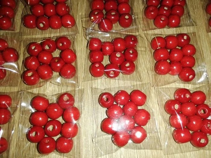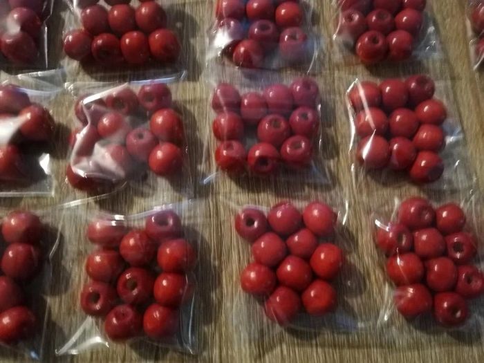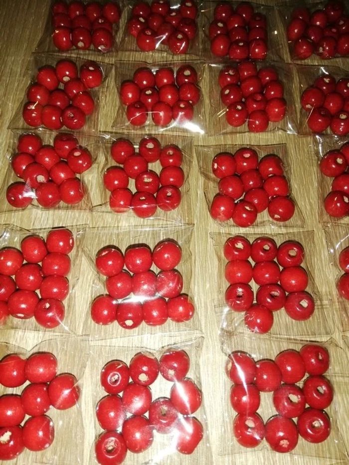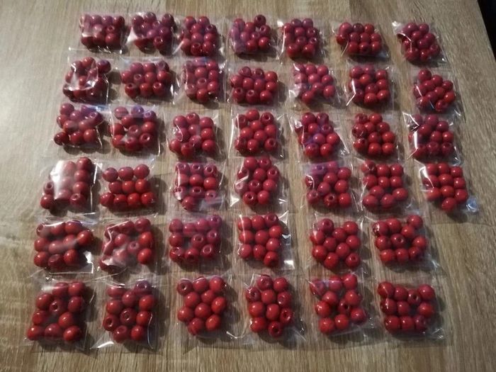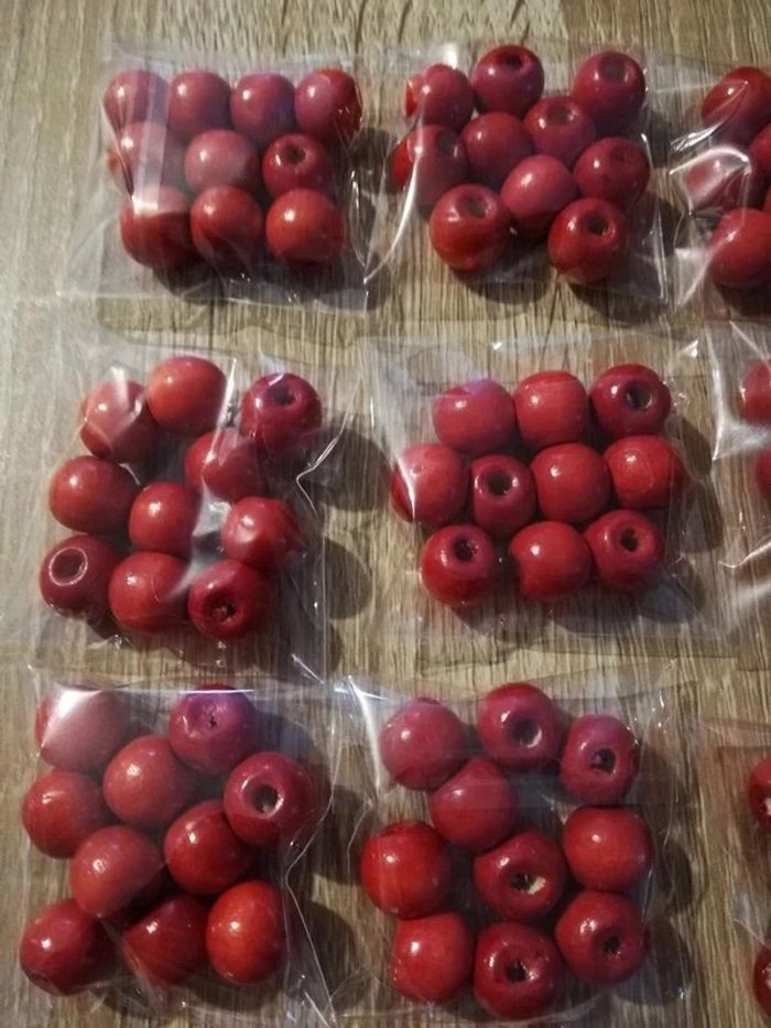 Lot de 40 sachets de perles en bois rouge 20euros le lot. Possible d'acheter à l'unité à 0,50cts le sachet n'hésitez pas à me le demander.