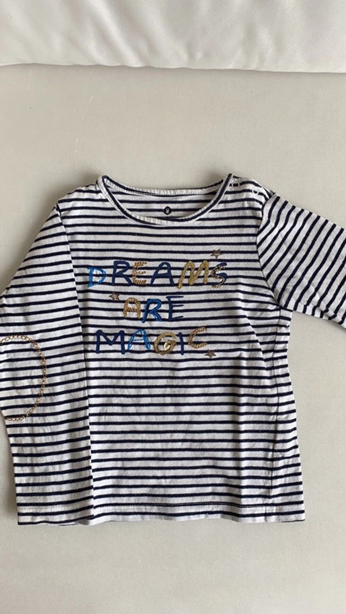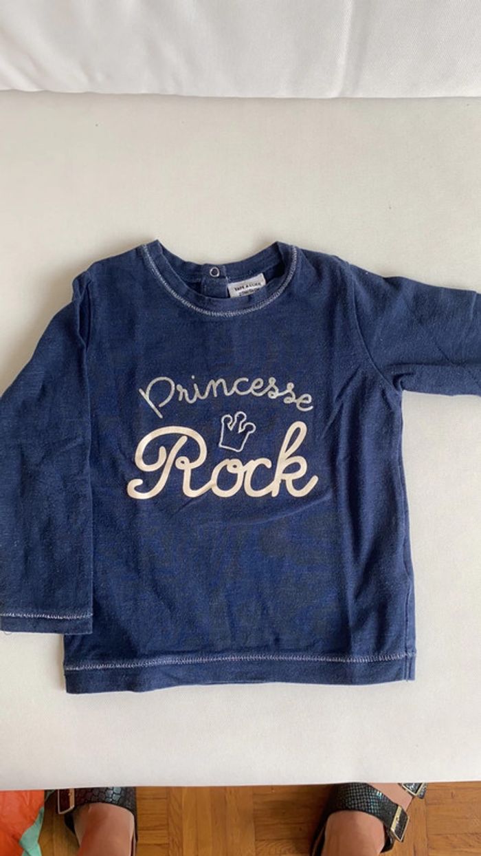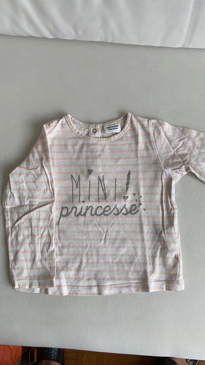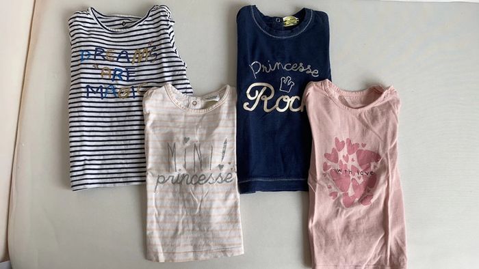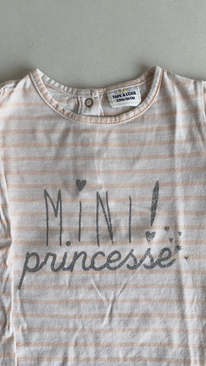 t shirt marinière grain de blé 24mois, motif un peu usé au niveau des étoiles + petite tache au niveau du coude t shirt marinière rose tape a l’oeil 23 mois ras t shirt rose coeurs kiabi 24 mois, décoloration au niveau du coude t shirt bleu princesse tape a l’oeiil 23 mois ras