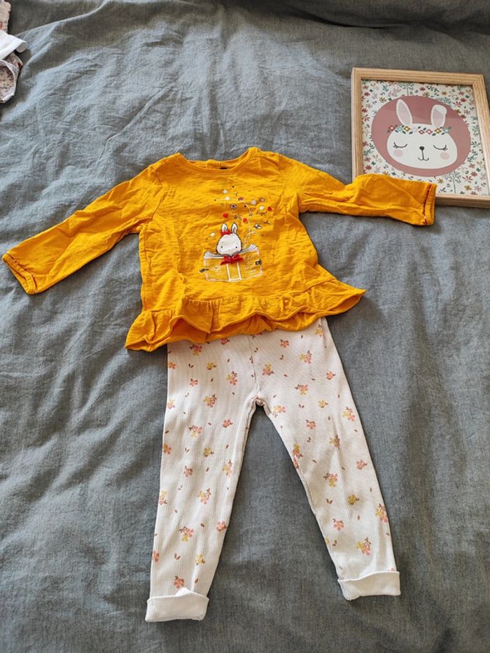 Adorable ensemble en 18 mois composé de : - un t-shirt à manches longues SERGENT MAJOR avec motif lapin et effet volanté sur le bas. Superbe matière texturée. Plein de jolis petits détails propres à la marque. Se ferme par 3 pressions à l'arrière. - un legging beige fleuri TAPE À L'OEIL en matière texturée également, très agréable à porter. Ensemble trop mimi porté, effet craquant garanti pour votre puce ! #18mois_macys76