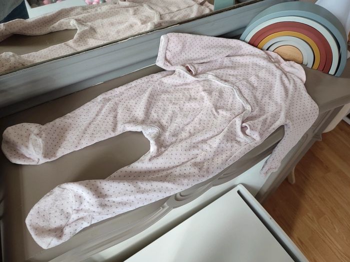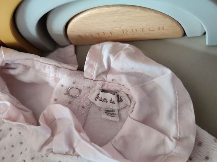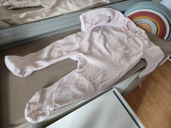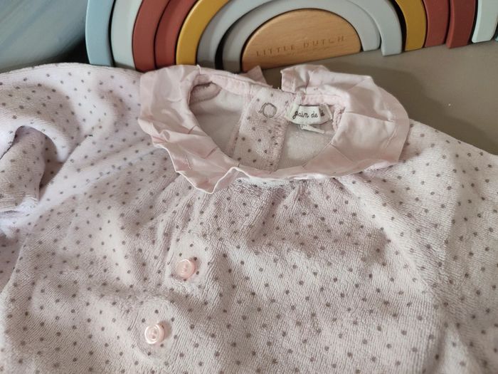 Adorable pyjama rose à pois gris GRAIN DE BLÉ. 9 mois. Très bon état car peu porté ! Adorable avec son col volanté, ses petits boutons sur le devant et tous ses petits pois. Se ferme intégralement par pressions à l'arrière. #9mois_macys76